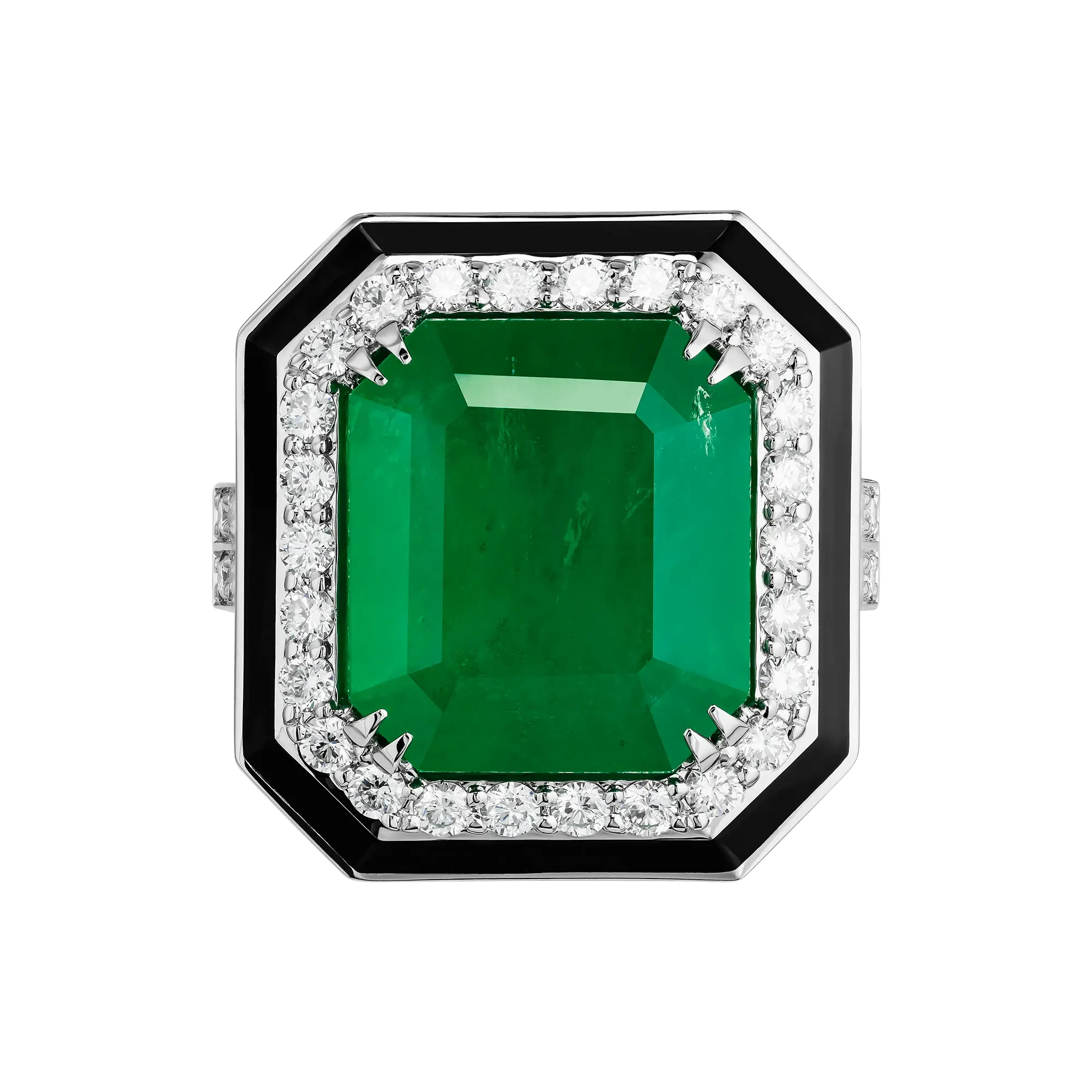 Оправа выполнена из белого золота и имеет подчёркнуто архитектурный характер. Устремлённые вверх линии поддерживают изумруд, оставляя его полностью открытым от площадки до шипа, что обеспечивает максимальное прохождение света через кристалл. Центральный камень окружён ореолом бриллиантов, дополненным геометрической рамкой, повторяющей его контур и выполненной в технике горячей эмали.
