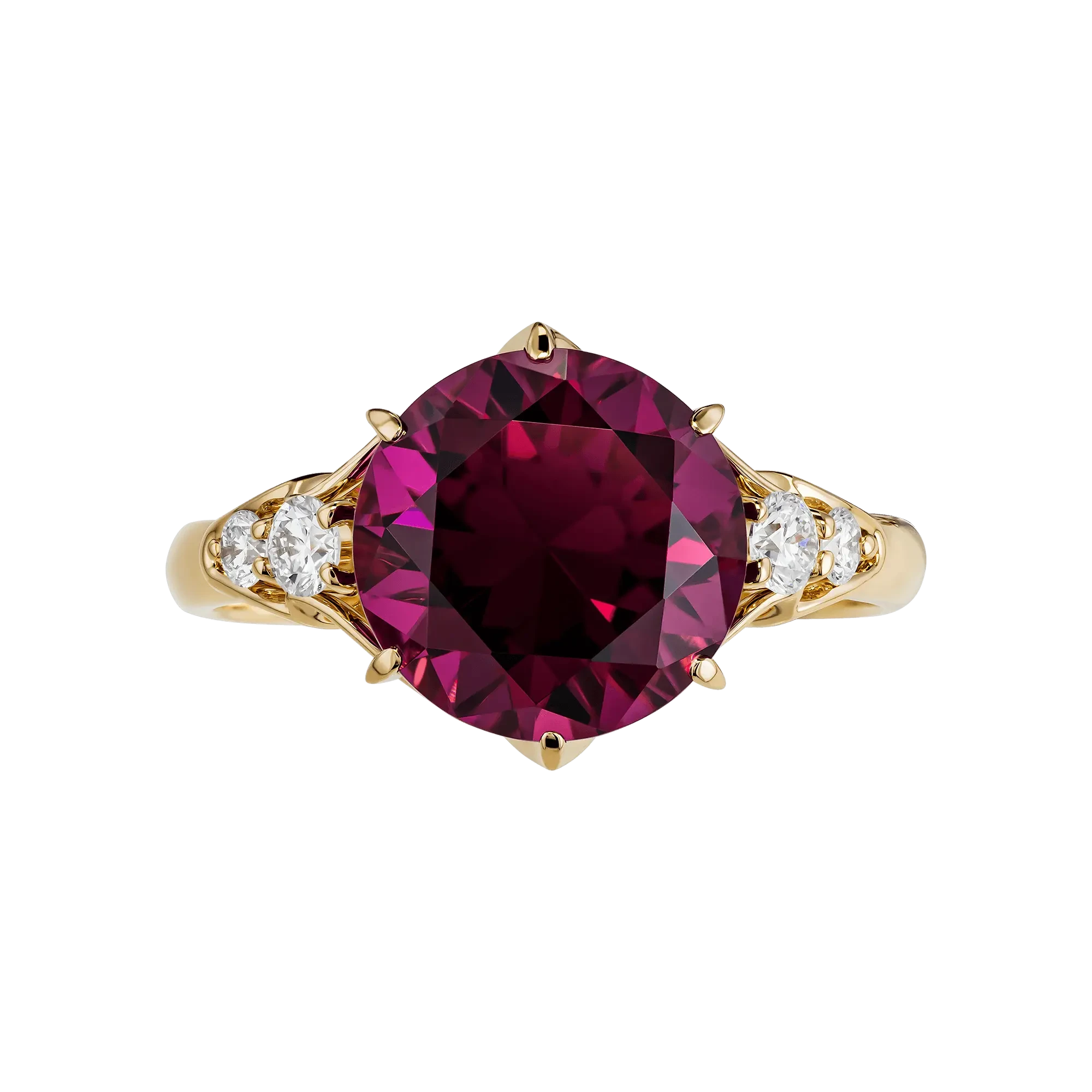 В центре композиции — танзанийский родолит весом 5,0 карат, одна из самых выразительных разновидностей граната. Этот самоцвет ценится за высокую прозрачность и насыщенный малиново-винный оттенок с лёгким фиолетовым подтоном, возникающим благодаря природному сочетанию магния и железа в структуре кристалла. Родолит сохраняет интенсивность цвета при различном освещении, а его огранка раскрывает живую, но собранную игру граней.