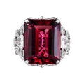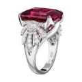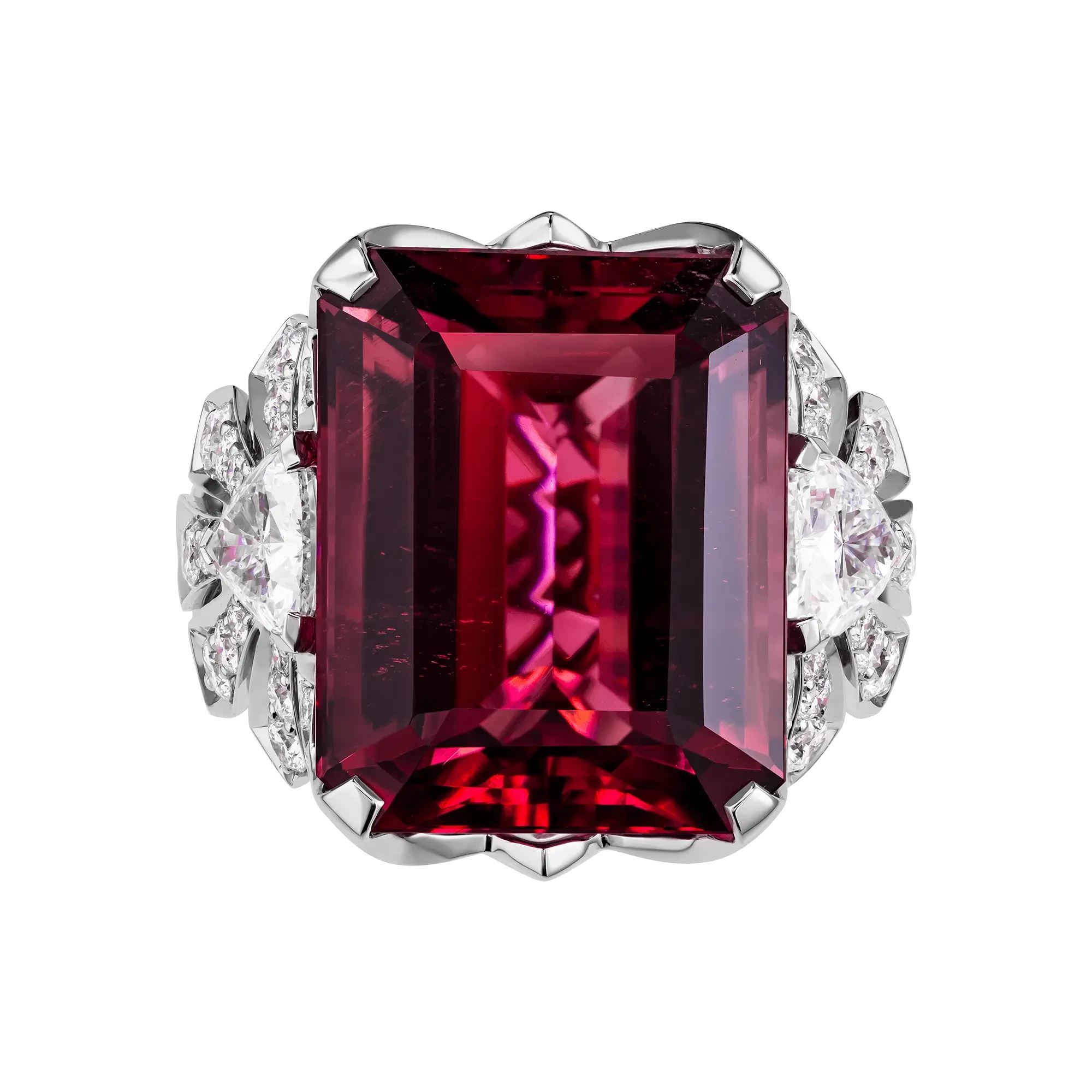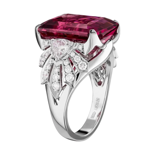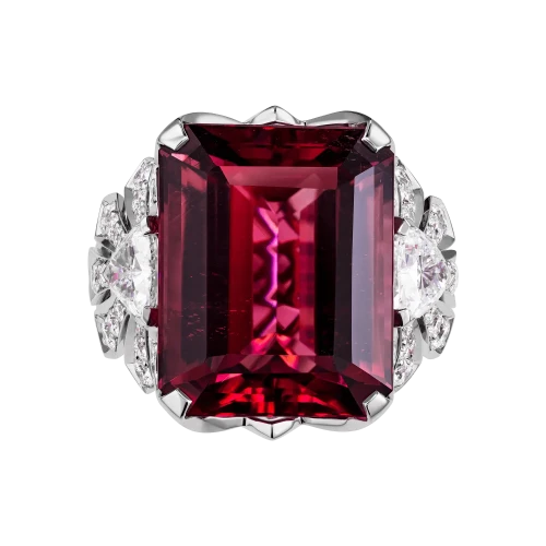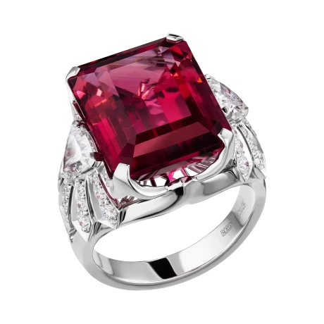 В центре композиции – розовый турмалин весом 15,73 карата, добытый в Африке. Драгоценный камень является истинной редкостью: насыщенный малиновый оттенок, исключительная прозрачность и внушительный размер делают его уникальным явлением в ювелирном мире. Прямоугольная огранка подчёркивает глубину кристалла, усиливая игру света и превращая его в яркий, почти императорский акцент.