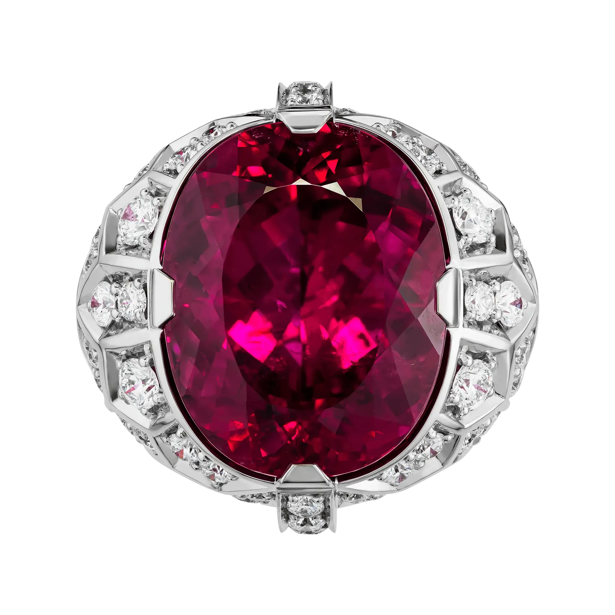 Рубеллит возвышается над оправой, выполненной из белого золота в форме массивного перстня, подчёркивая его статус доминирующего элемента композиции. Россыпь крупных бриллиантов формирует вокруг центрального камня сияющий ореол, усиливая эффект драгоценного света и создавая ощущение торжественности. Белое золото выступает благородным фоном, на котором цвет рубеллита раскрывается с максимальной выразительностью. В результате украшение становится не просто ювелирным объектом, а символом пути, редкости и истинной ценности — той, что не теряет силы сквозь века.
