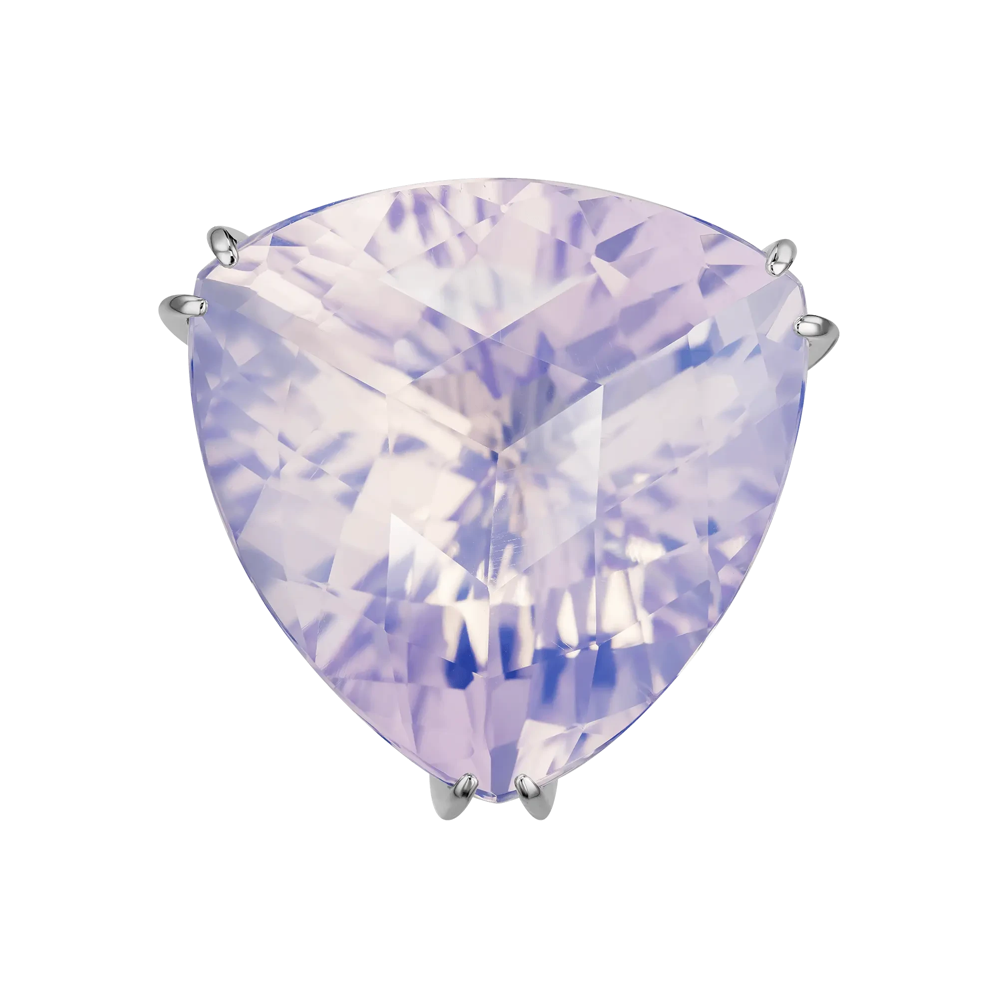 В центре композиции – лавандовый аметист весом 85,82 карата, природный камень редкого оттенка, сочетающего нежность сирени и прохладу утреннего света. Его прозрачность и тонкое внутреннее свечение создают ощущение лёгкости. Такой оттенок встречается исключительно в аметистах высшего класса, добытых на ограниченных месторождениях Южной Америки.