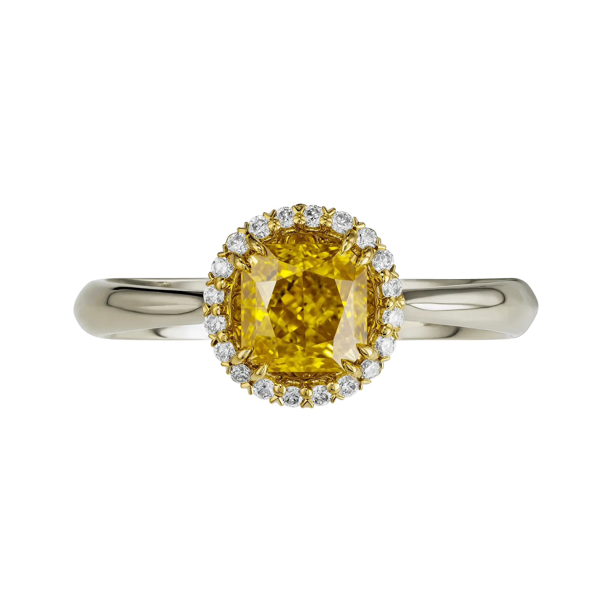Мастера ювелирного дома усилили природную выразительность камня особым художественным решением. Чаша под центральным бриллиантом выполнена из жёлтого золота и инкрустирована жёлтыми сапфирами — этот скрытый акцент мягко усиливает насыщенность оттенка, позволяя бриллианту раскрывать ещё более яркое солнечное сияние. Окружение из прозрачных бриллиантов вокруг центрального камня создаёт эффект светящегося ореола, подчёркивая глубину цвета и придавая украшению дополнительную выразительность.