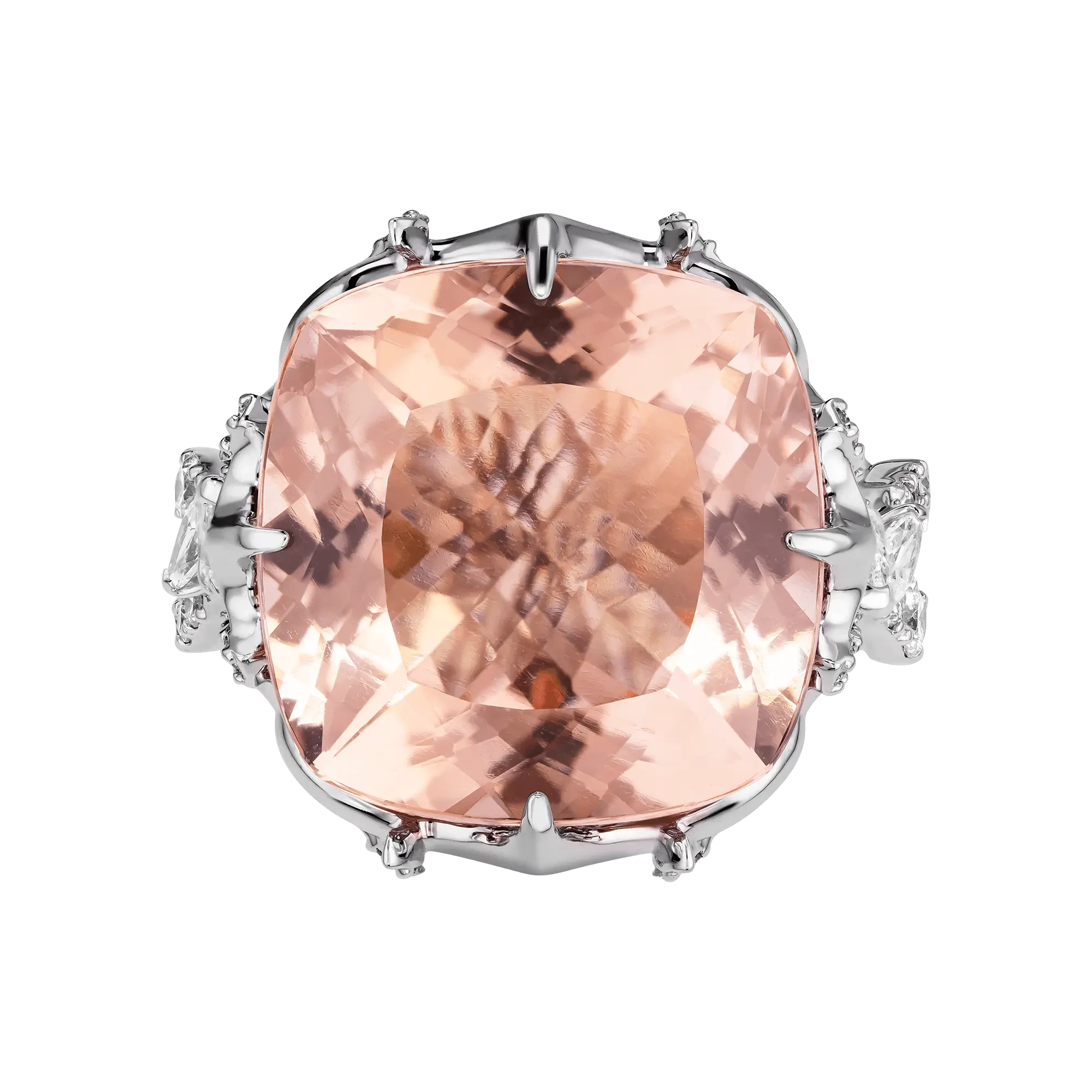 В центре творения – бразильский морганит весом 11,54 карат, чья палитра переливается от прозрачного пудрового свечения до нежного розового отблеска. Природный камень словно хранит в своей глубине дыхание нового дня, когда горизонт впервые загорается мягким румянцем, а свет ещё чист и первозданен.