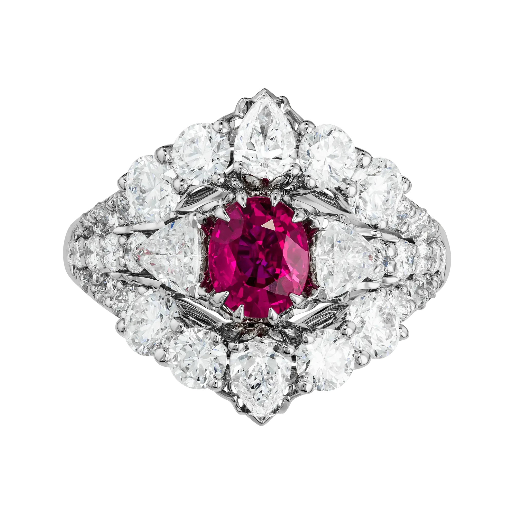 Кольцо выполнено в формате трансформируемого ювелирного объекта, допускающего смену художественного масштаба. В раскрытой, коктейльной конфигурации композиция приобретает экспрессивный характер: центральный рубин насыщенного алого оттенка, добытый на месторождении Мозамбика, доминирует в пространстве, окружённый сложным ореолом бриллиантов различной огранки. Их многоуровневая световая структура формирует динамичную среду, в которой цвет воспринимается как движущаяся энергия.