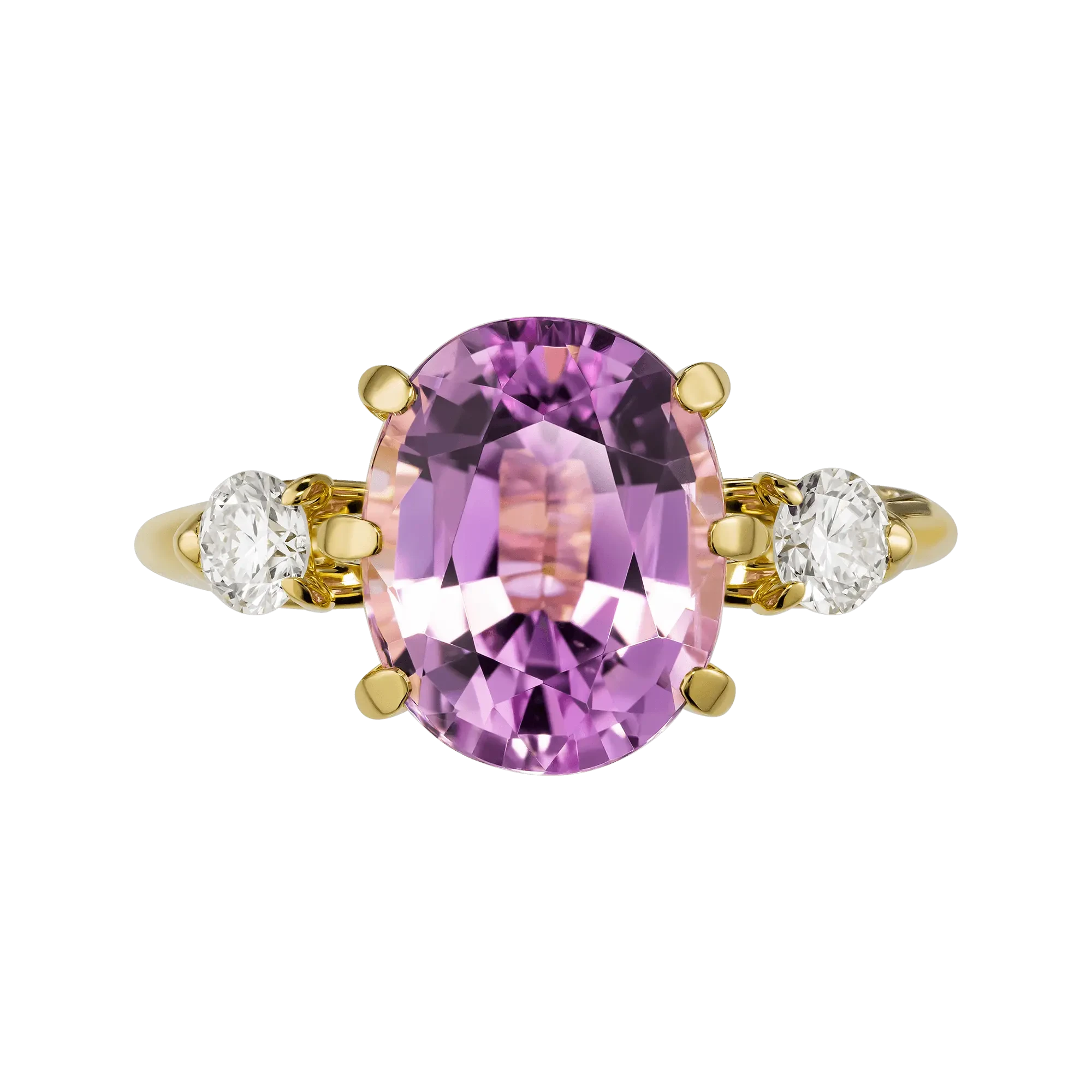 Два бриллианта по бокам поддерживают кунцит, как паузы между словами, в которых скрыто главное. Оправа из жёлтого золота объединяет композицию в цельный, спокойный жест — без излишеств и напряжения.