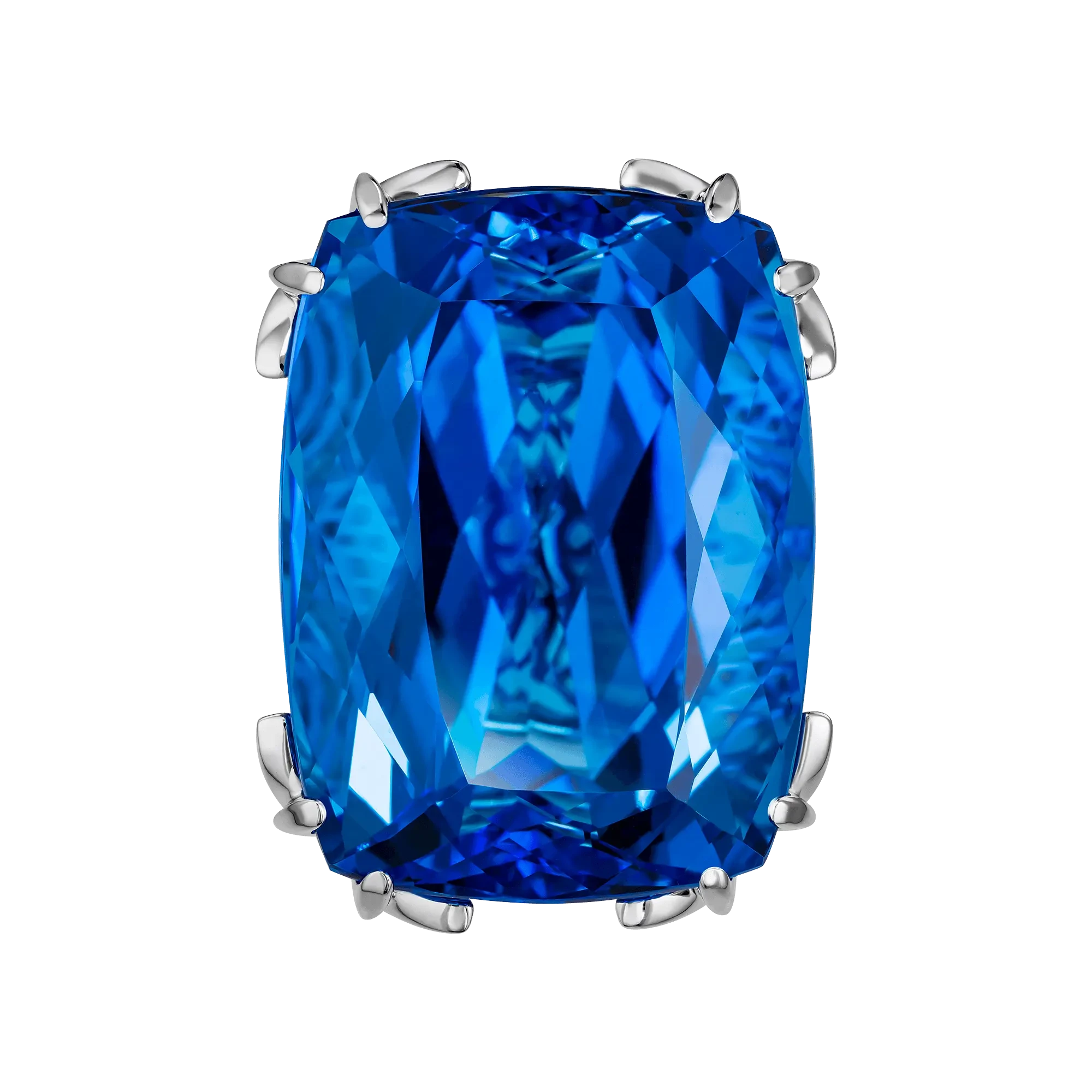 В его сердце сияет крупный топаз редчайшего оттенка Super Swiss весом 79,94 карата, добытый на Шри-Ланке – острове, где небо словно отражается в воде. Драгоценный камень будто хранит дыхание моря: внутри него мерцают струи света, переливающиеся от лазурного до глубокого индиго. Каждый поворот кристалла рождает новую волну цвета – как если бы само море дышало в ладонях.