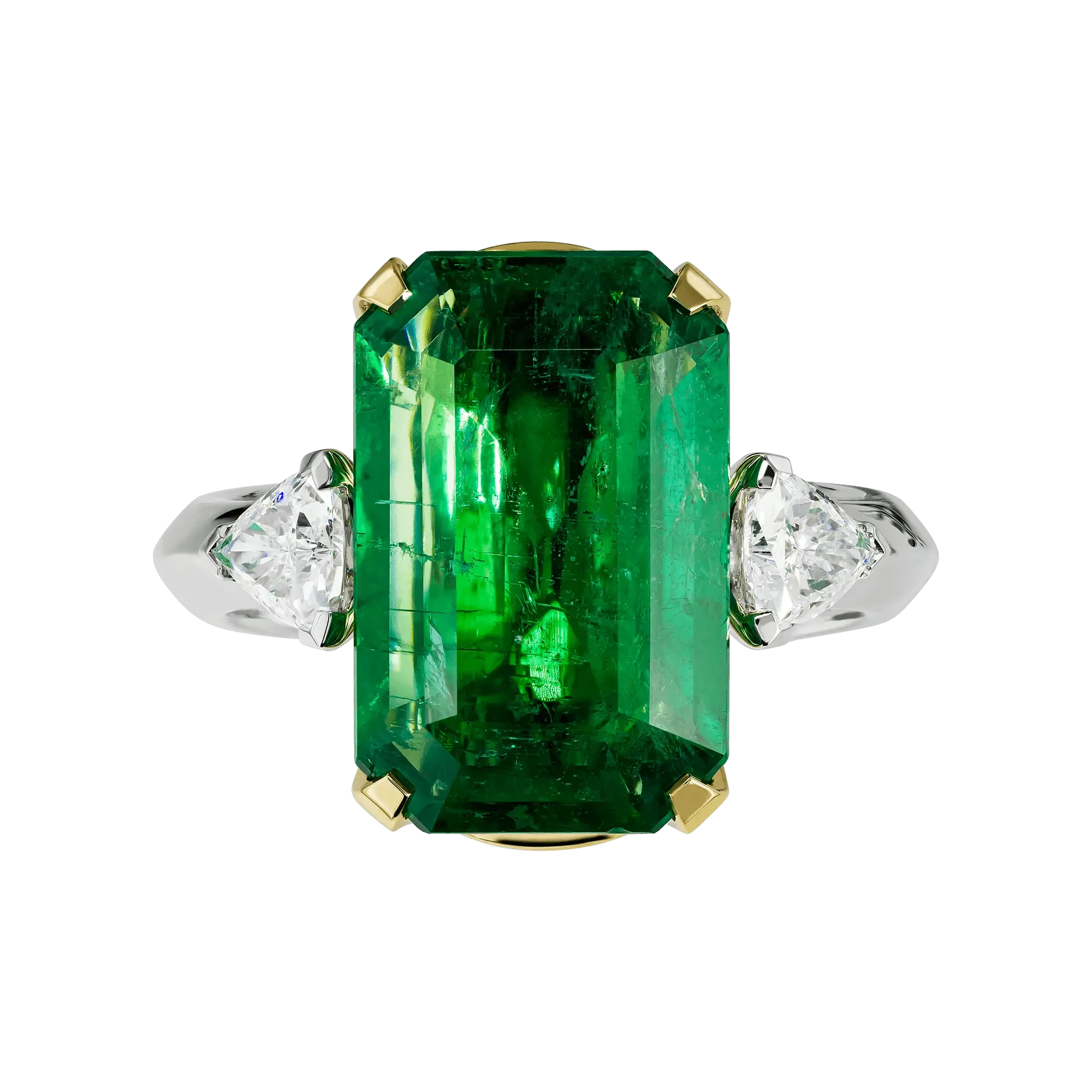 Жёлтая оправа центрального камня подчёркивает глубину его оттенка и усиливает ощущение тепла, тогда как основная часть кольца выполнена из белого золота, формирующего выверенный контраст между изумрудом и бриллиантами-спутниками. Их холодное сияние задаёт чёткую архитектуру формы и придаёт композиции равновесие и завершённость.