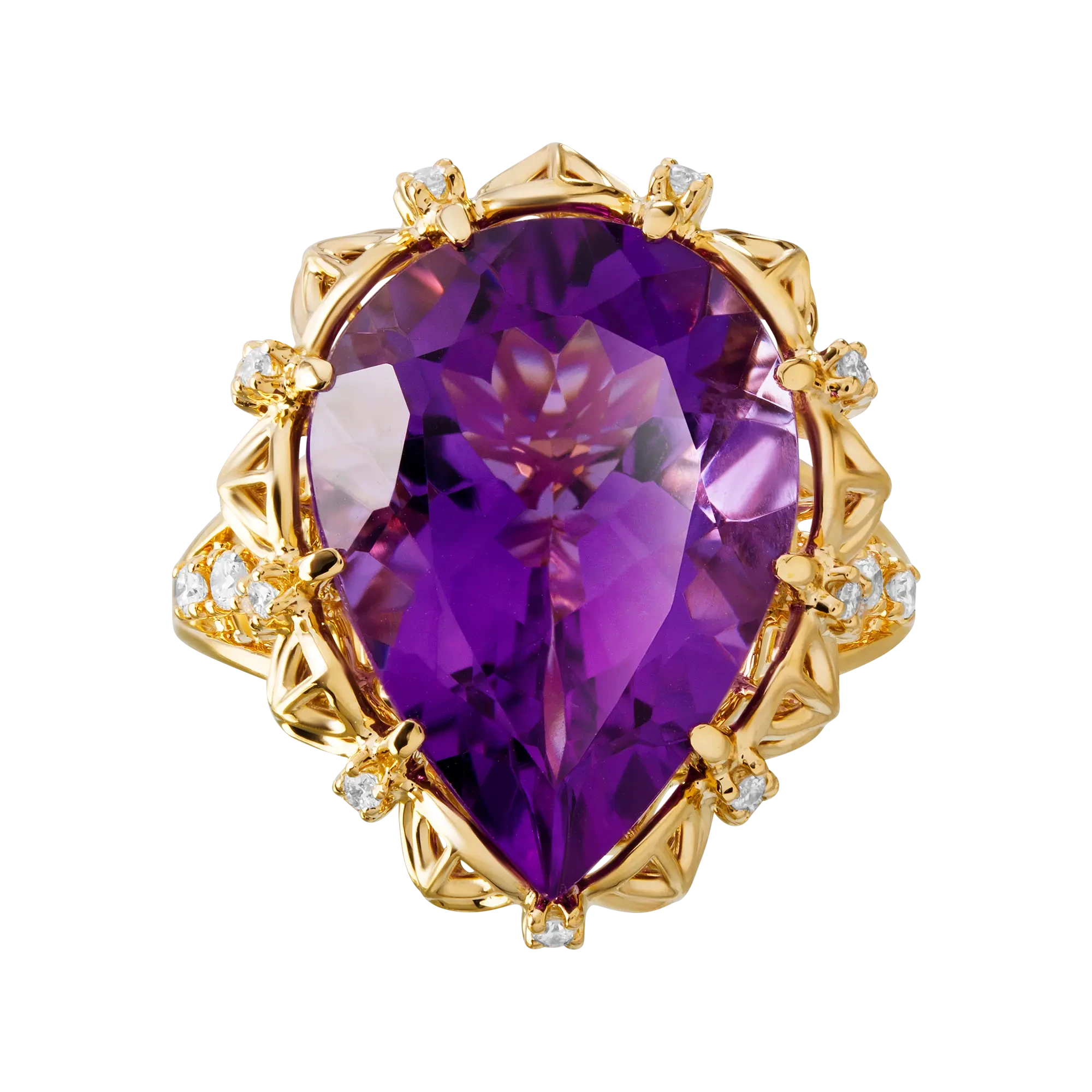Довершившись опыту и собственному творческому видению, дизайнеры превратили крупный аметист в главную кульминацию ажурного кольца.
