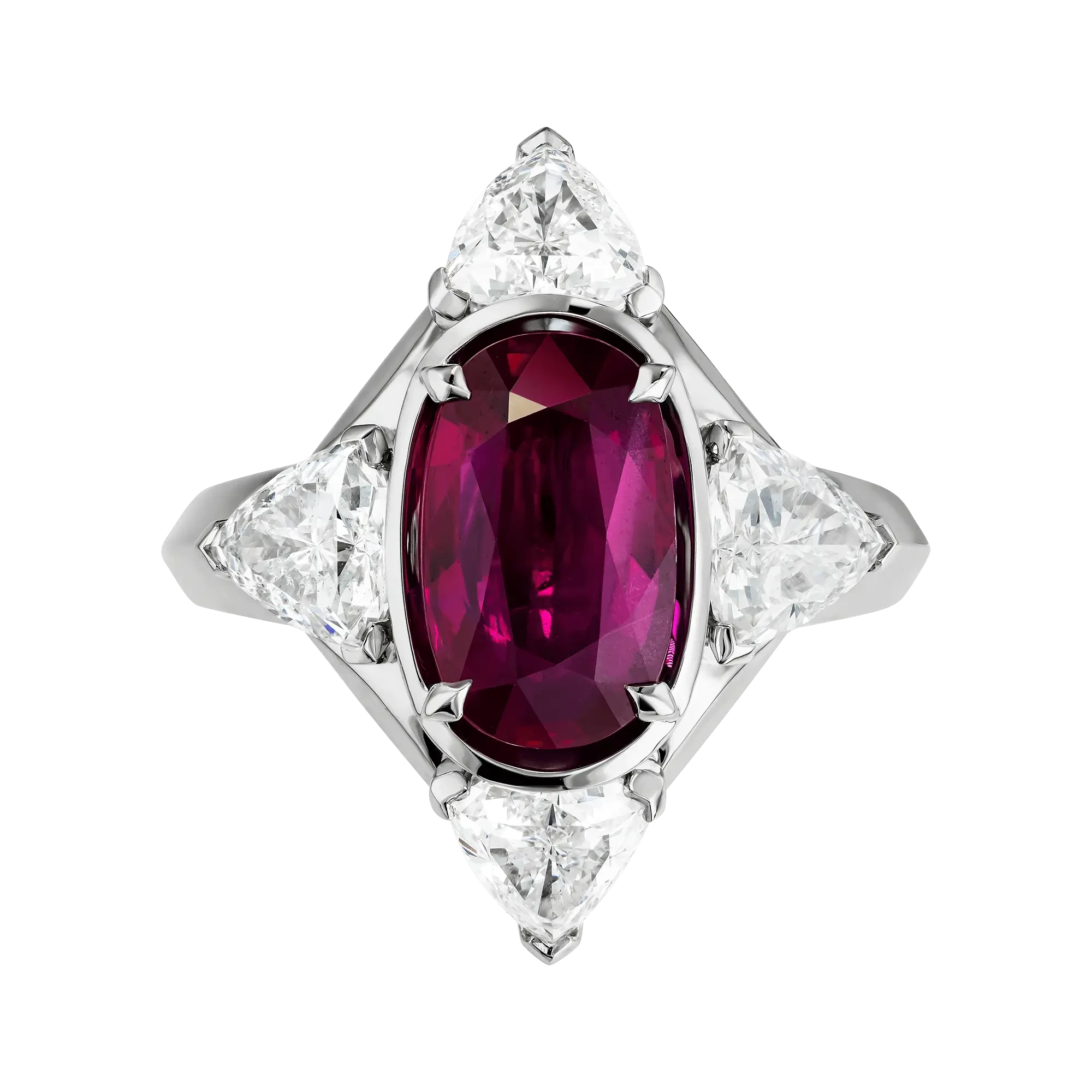 Оправа из белого золота решена в форме четырёхконечной звезды. Крупные бриллианты нетривиальной огранки образуют световую геометрию вокруг центрального камня, усиливая его насыщенность и подчёркивая глубину оттенка. Холодное сияние бриллиантов создаёт контраст, благодаря которому рубин словно загорается ещё ярче, становясь истинной «вечерней звездой» композиции.