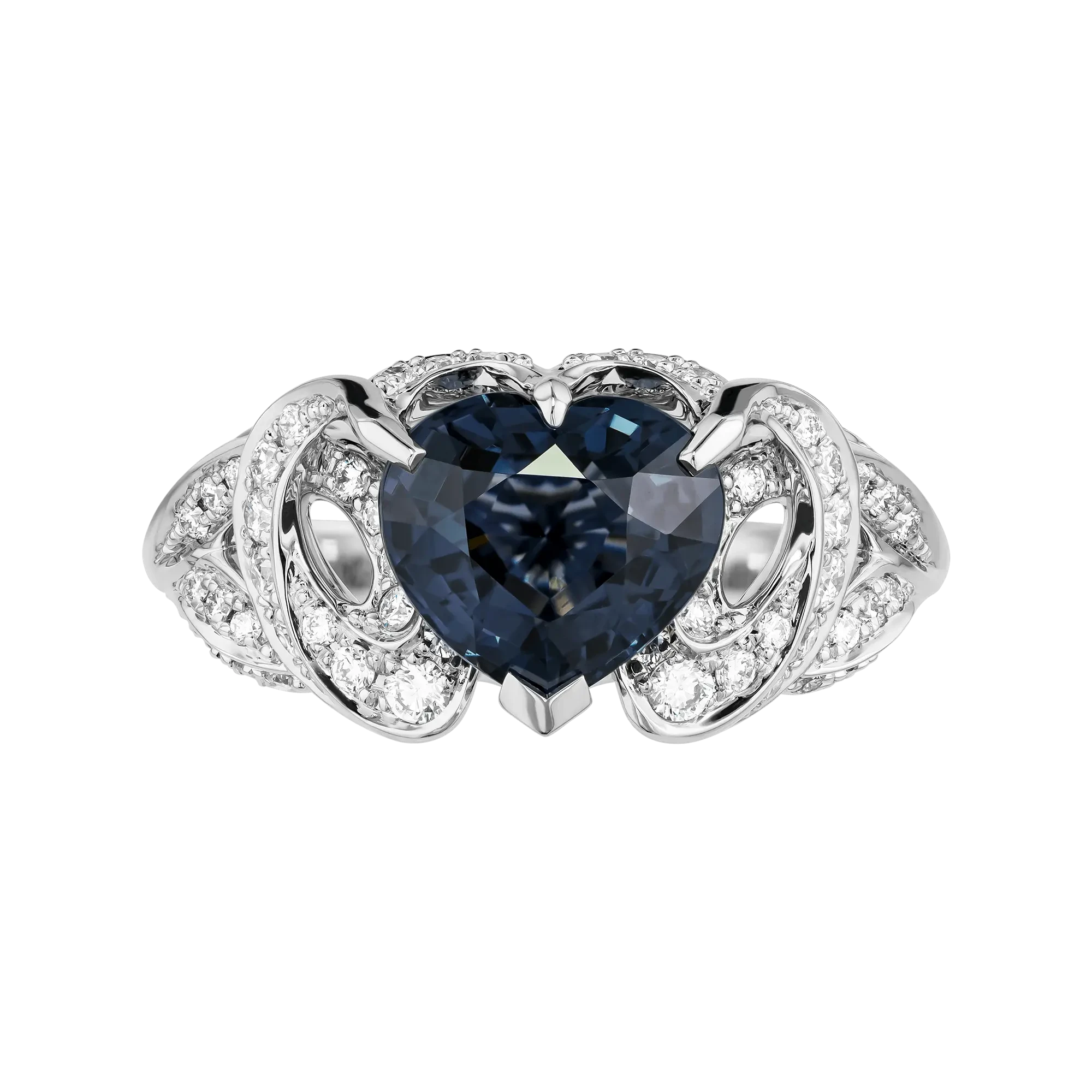 В центре композиции — благородная шпинель редкого черничного оттенка весом 2,83 карата. Её глубокий цвет воспринимается как состояние: сдержанное, собранное, наполненное внутренней силой. Огранка в форме сердца здесь не буквальна — она становится знаком единения, в котором важна не демонстрация эмоций, а их подлинность и равновесие. Природное происхождение самоцвета подтверждено международным сертификатом GFCO GEM LAB (Швейцария), подчёркивающим ценность камня не только эстетическую, но и смысловую.