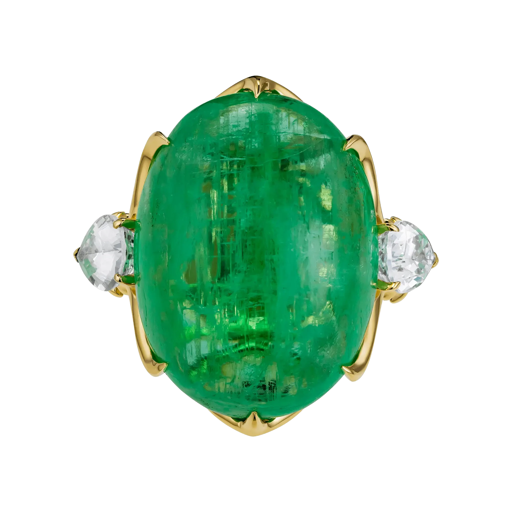 В центре композиции сияет уральский изумруд весом 12,61 карата, добытый на Малышевском месторождении – сердце Урала, где рождение каждого драгоценного камня подобно чуду. Его нежный зелёный оттенок напоминает первые ростки, пробивающиеся сквозь лёд, а мягкая полупрозрачность словно хранит в себе тепло солнца, отражённое в талой воде.