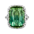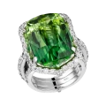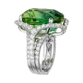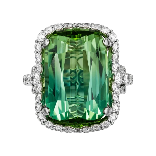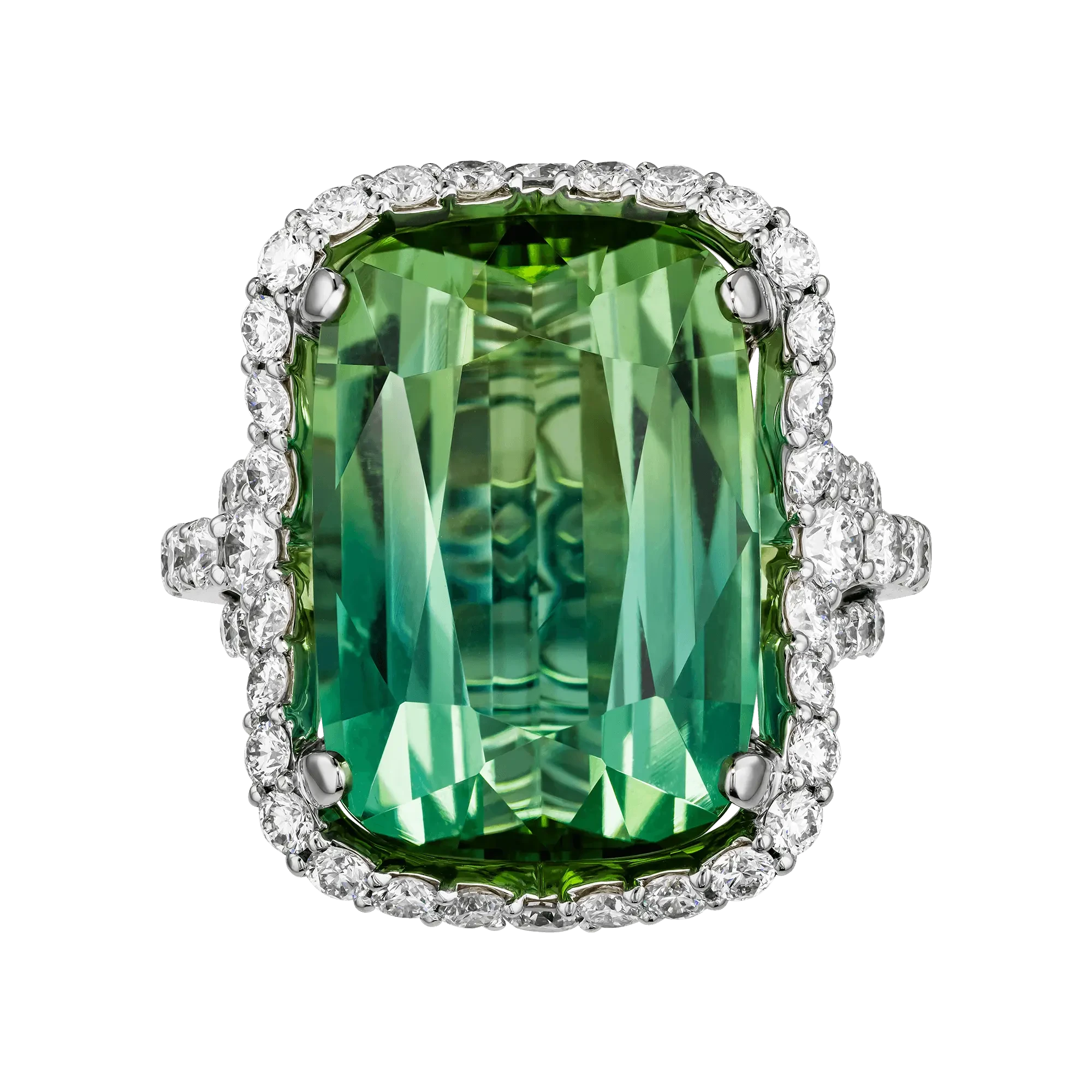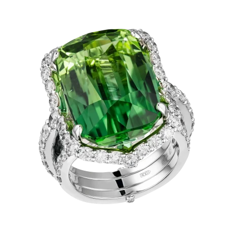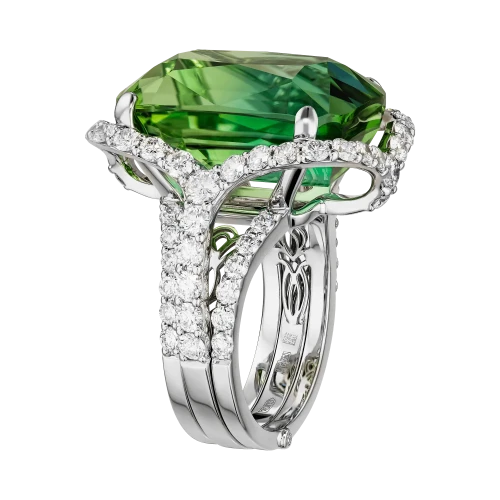 В центре композиции сияет редкий зелёный турмалин весом 24,10 карата, добытый в Конго – земле, где рождаются самые крупные и чистые кристаллы. Его уникальная игра оттенков создаёт иллюзию движения: от насыщенного изумрудного до светлого, почти прозрачного жёлто-зелёного – как если бы в камне застыл живой свет тропического солнца.