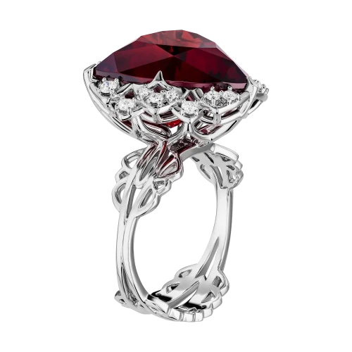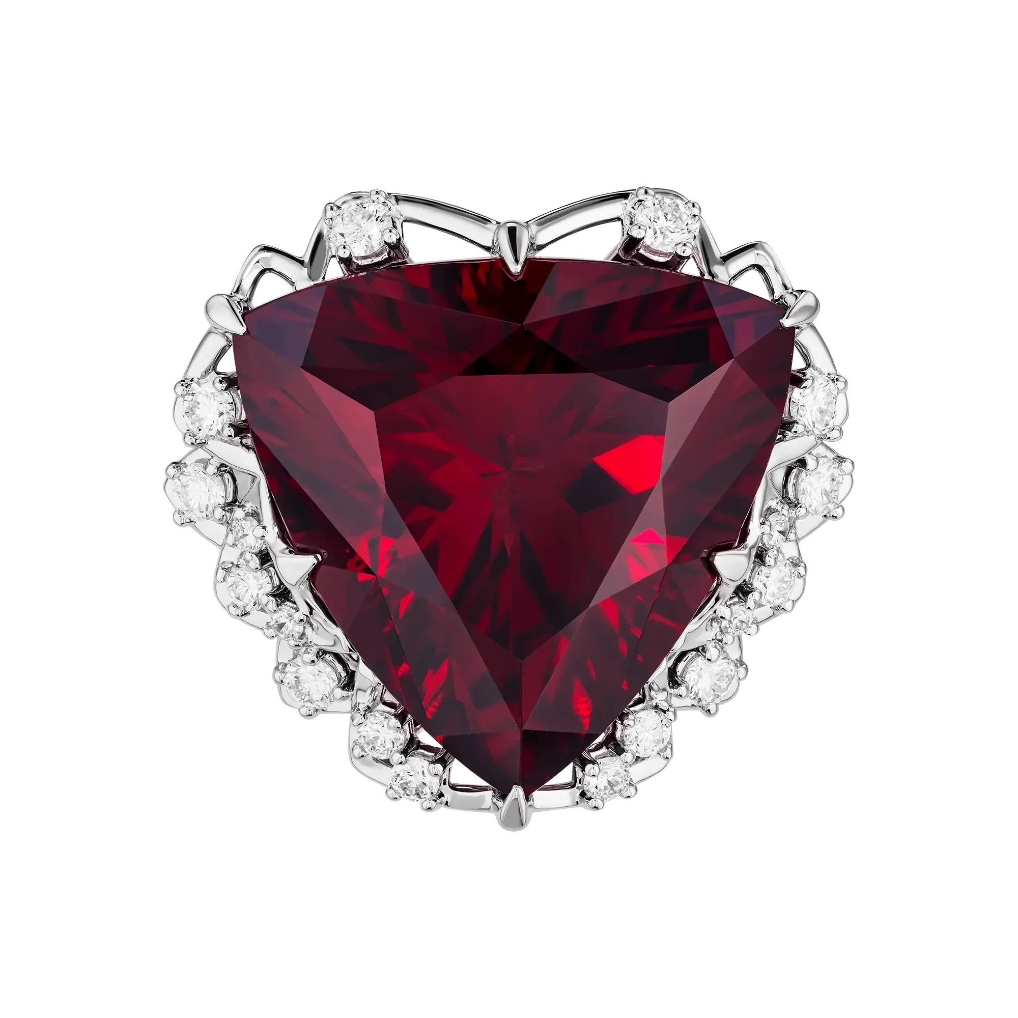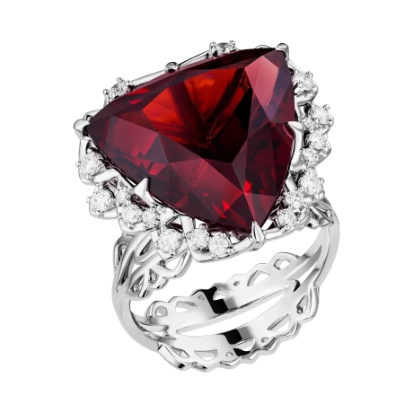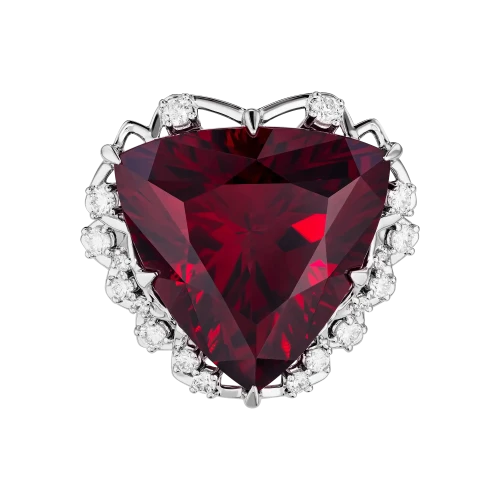 С древности огненные самоцветы считались вестниками неугасимой энергии, хранящей тайну зарождения и обновления бытия. Родолит весом 18,12 карат в редкой огранке «триллион» предстаёт здесь как образ вечного пламени – того, что неподвластно времени и всегда пробуждается в новых формах. Его сияющий красно-бордовый оттенок воплощает жизненную силу и внутренний свет, способный очищать и укреплять душу.
