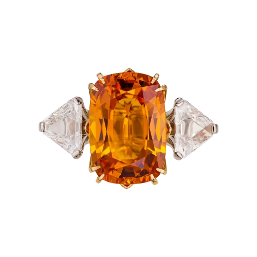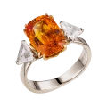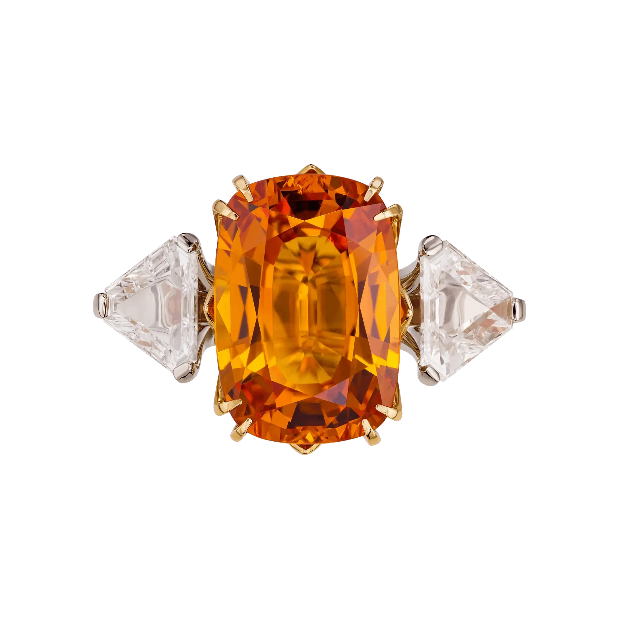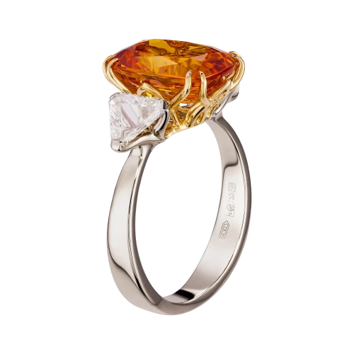 В центре ювелирного произведения сияет спессартин из Бирмы весом 6,04 карат – минерал, по праву считающийся одним из самых редких и ценных представителей семейства гранатов. Камни подобного происхождения отличаются высокой прозрачностью, насыщенностью оттенка и яркой огненной игрой – качествами, которые особенно ценятся экспертами и коллекционерами по всему миру. Международный сертификат GFCO GEM LAB подтверждает подлинность и исключительность самоцвета, закрепляя за ним статус эталона среди цветных камней.