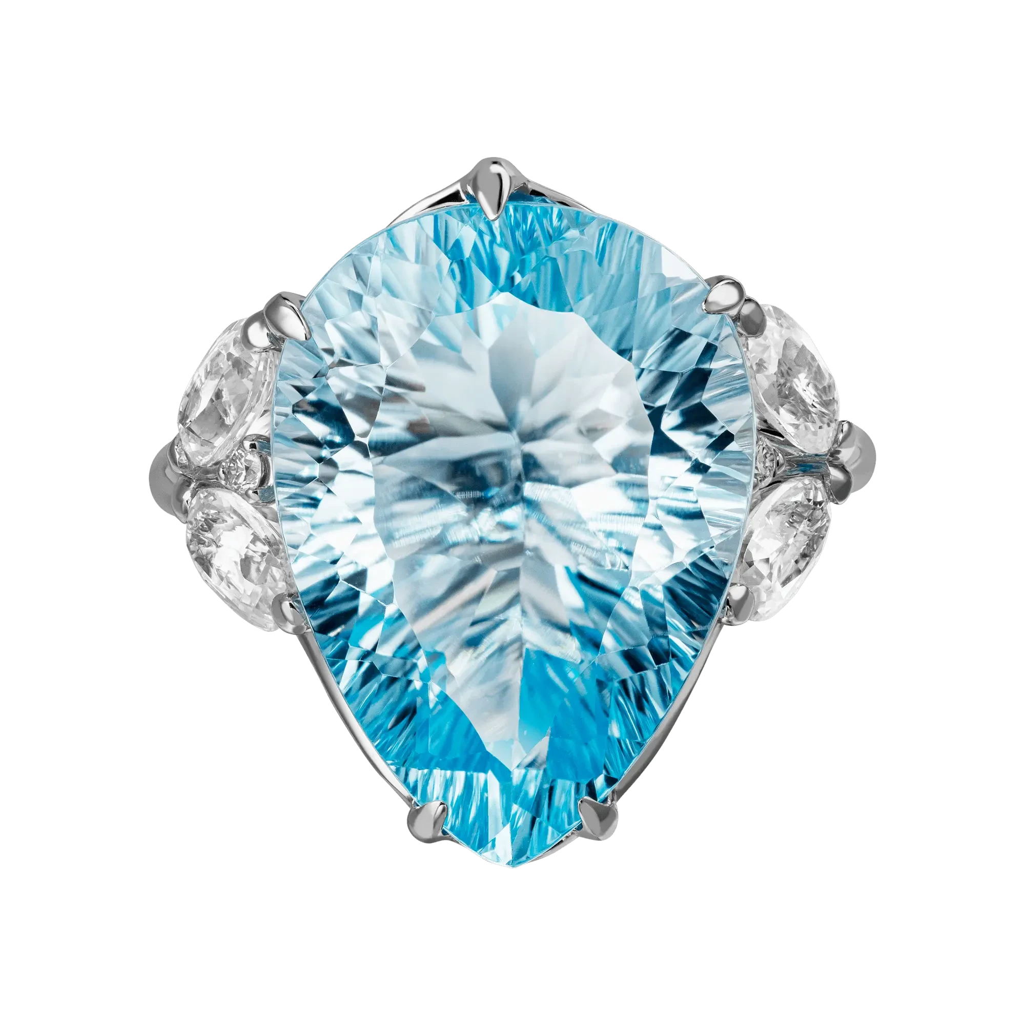 Отражением впечатлений создателей ювелирного совершенства стал чистой воды топаз весом 14,19 карата. Безупречную крупную каплю нежно-голубого цвета, предварительно виртуозно ограненную, мастера надежно закрепили в элегантной оправе из белого золота.