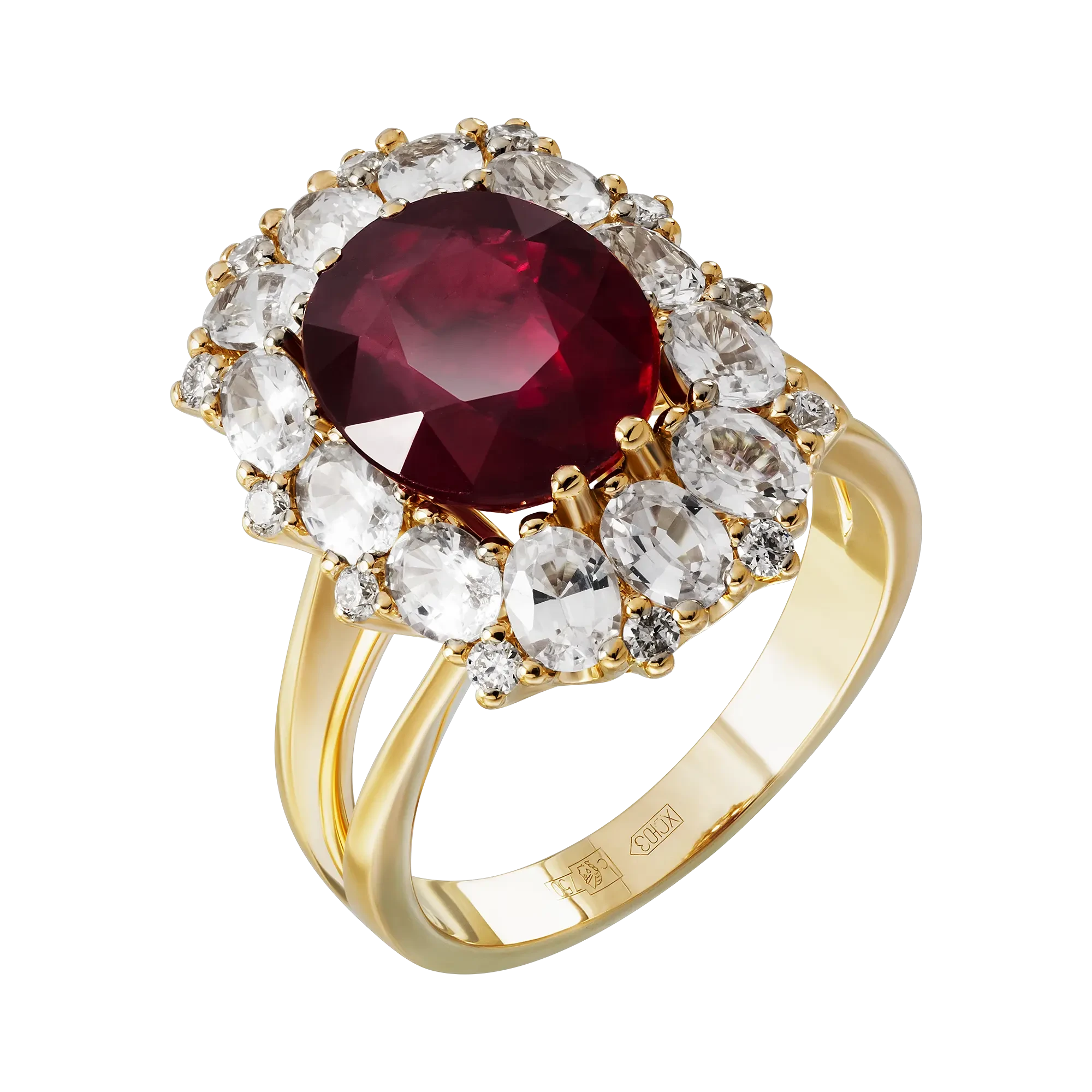 Главным огненным знаком головокружительного кольца стал фантастический крупный рубин, «дышащий» силой. Переливаясь в лучах света, чистейший мозамбикский самоцвет весом 3,74 карата, в гармоничном симбиозе с бриллиантовым и сапфировыми всполохами, едва сдерживаемыми филигранной оправой из желтого золота, демонстрирует величие своего пламенного духа, принесшего ему славу драгоценного символа страсти.