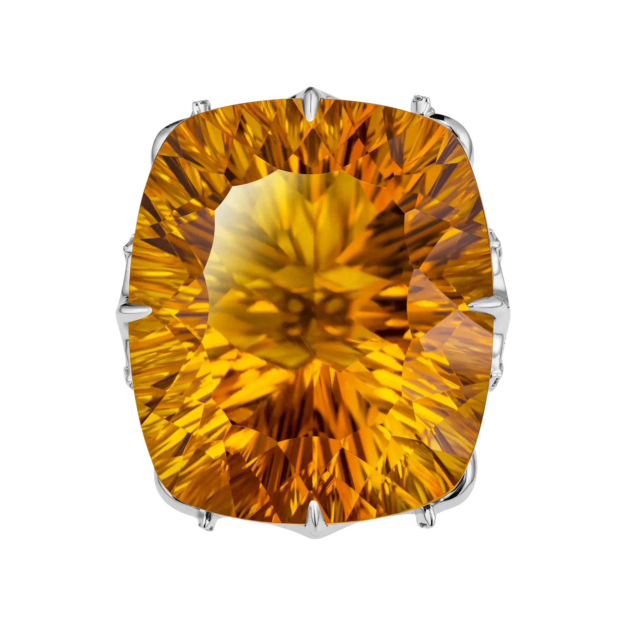 В центре композиции – крупный бразильский цитрин весом 37,15 карата, редкий камень, чьи солнечные переливы напоминают мгновение перехода дня в вечер, когда лучи заката превращают воздух в жидкое золото. Его оттенок вобрал в себя свет двух миров – земного и небесного, а прозрачная глубина создаёт эффект внутреннего дыхания, словно самоцвет соткан из самого света.