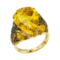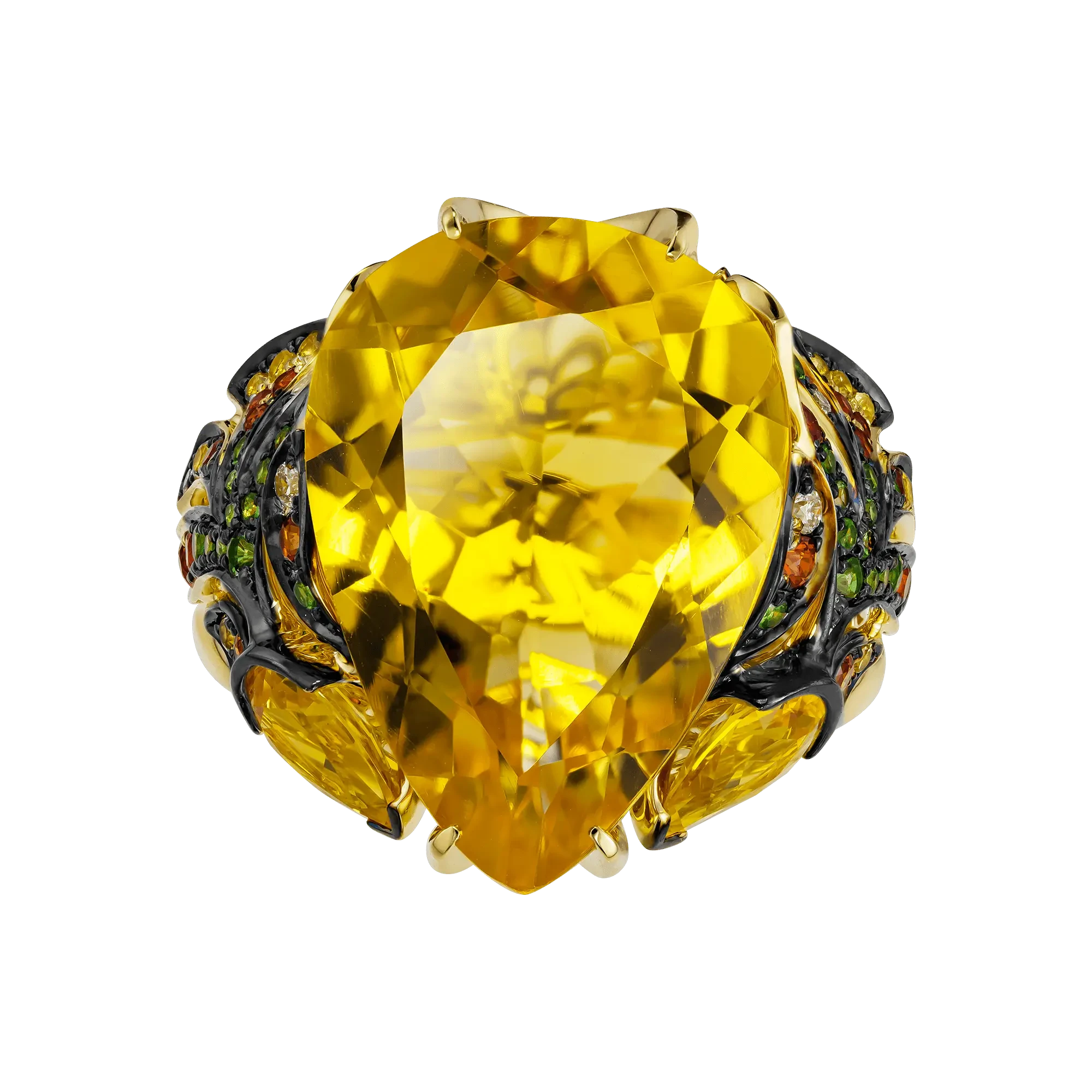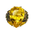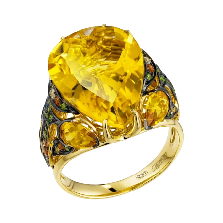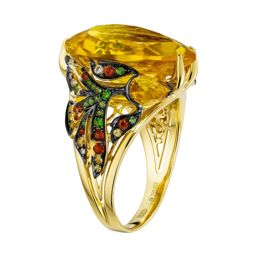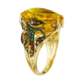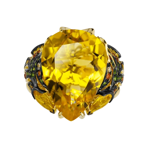 По бокам центральный цитрин поддерживают две стилизованные золотые рыбки — тонко проработанные, инкрустированные бриллиантами, цветными сапфирами и тсаворитами. Они образуют динамичную композицию, где движение направлено к центру, словно оберегая и усиливая его энергию. Кольцо из коллекции Animals становится не просто украшением, а талисманом удачи, изобилия.