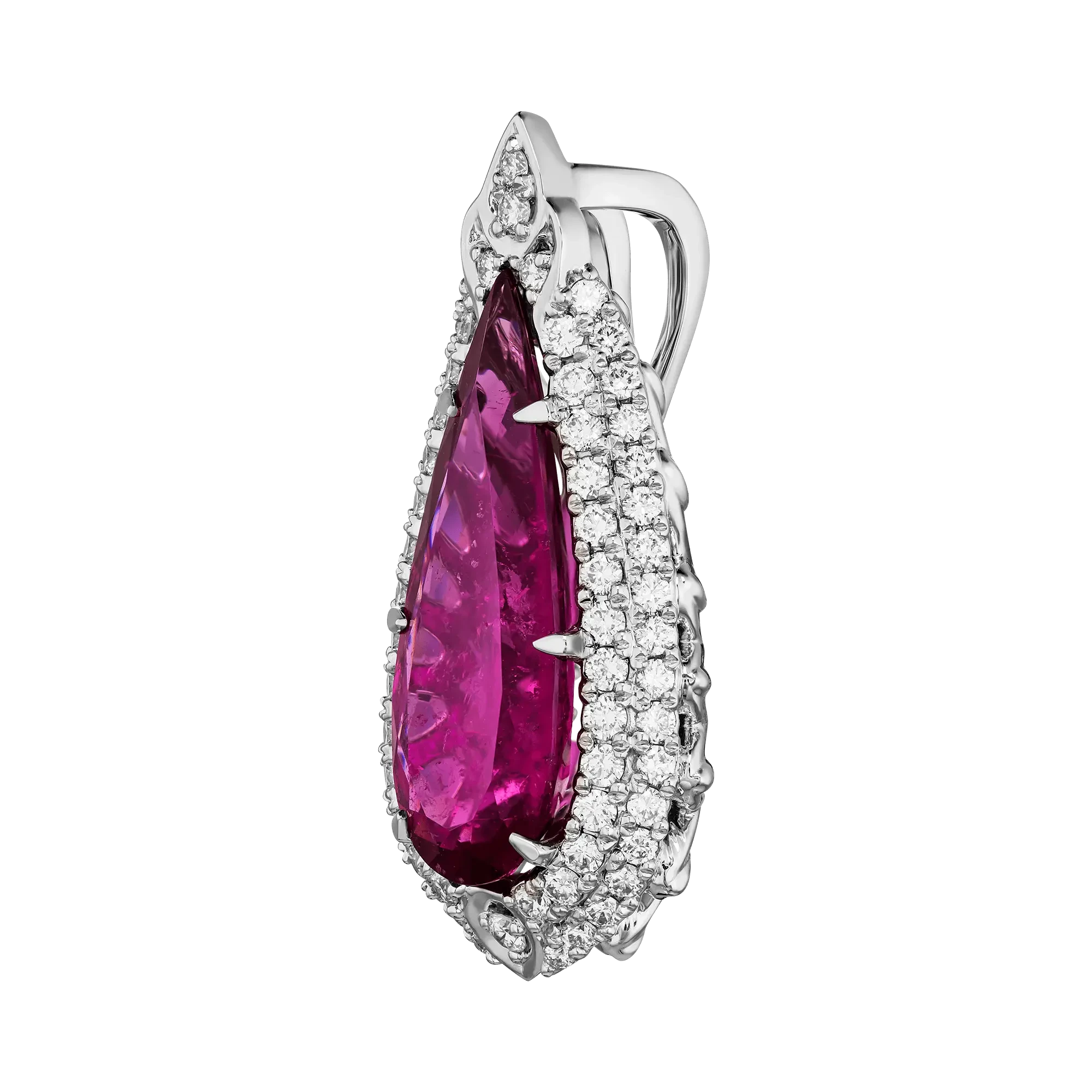 Бриллианты, обрамляющие камень, повторяют форму капли, создавая ауру света, в которой рубеллит раскрывает всю силу своего сияния. Белое золото подчёркивает его прозрачность и насыщенность, превращая подвеску в символ радости и внутреннего равновесия.
