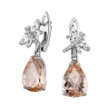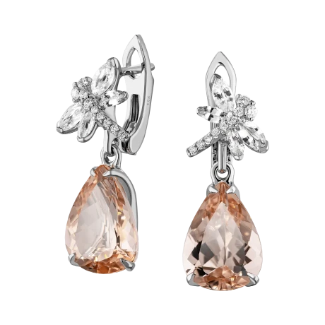 Привлекательность украшения гарантируют роскошные морганиты нежно-пудрового цвета. Фантазийная игра света, рождаемая в глубинах персиковых самоцветов, в меру сочная и, в то же время, очень нежная, смотрится невероятно изысканно в обрамляющих центральные кристаллы бриллиантах и сапфирах, собранных ювелирами в фигуры легкокрылых стрекоз.