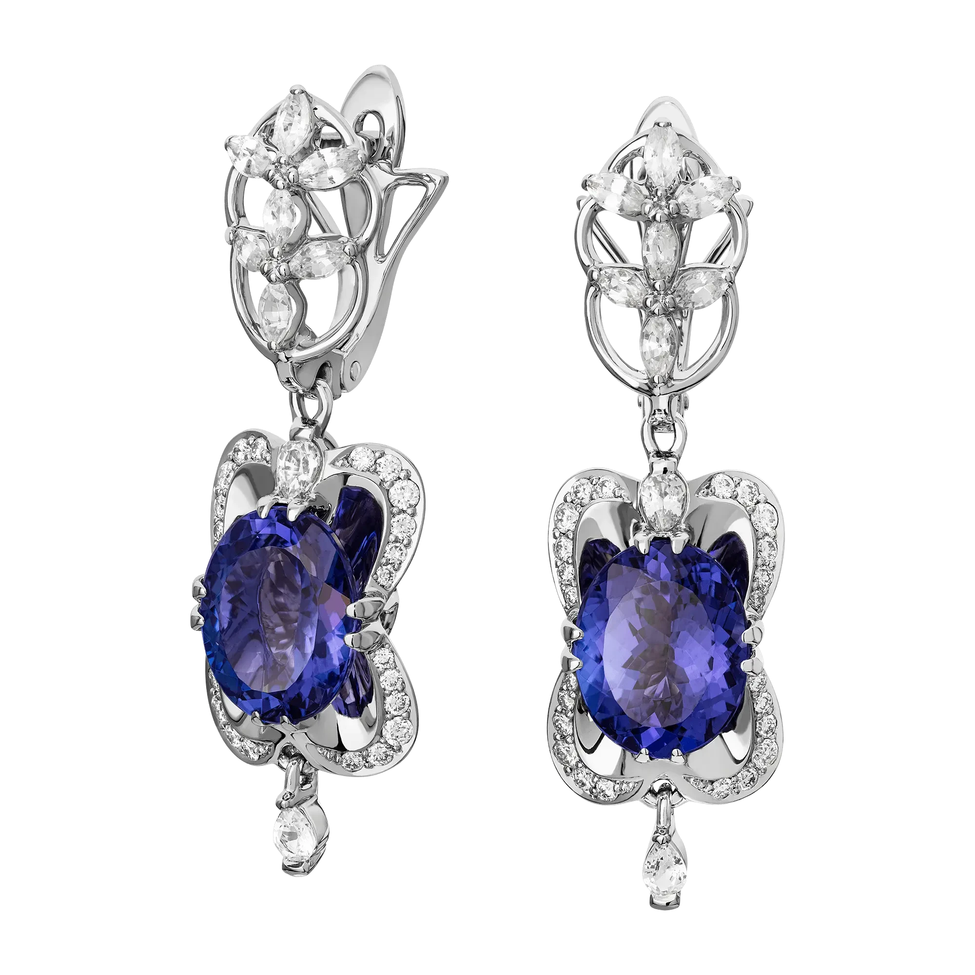В центре композиции сияют танзаниты глубокого сине-фиолетового оттенка, заключённые в зеркальные чаши из белого золота. Свет, отражаясь внутри оправы, многократно усиливает их внутреннее свечение – словно в драгоценных камнях запечатлён отблеск старинных свечей и тихое дыхание балов прошлого. Цвет танзанитов рождает иллюзию движения, будто они тают в свете, оставляя след – прозрачный и чарующий.