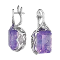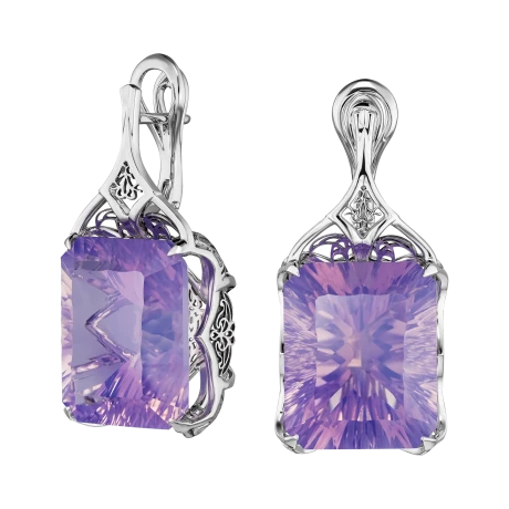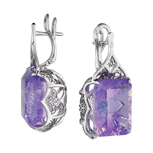 В серьгах «Эфира кружево» лавандовые аметисты обретают форму света и воздуха. Самоцветы общим весом 38,10 карата воспринимаются как полупрозрачные объёмы, в которых оттенок раскрывается мягко и глубинно — от прохладной дымки до насыщенной фиалковой тональности, меняясь при каждом движении и повороте головы.