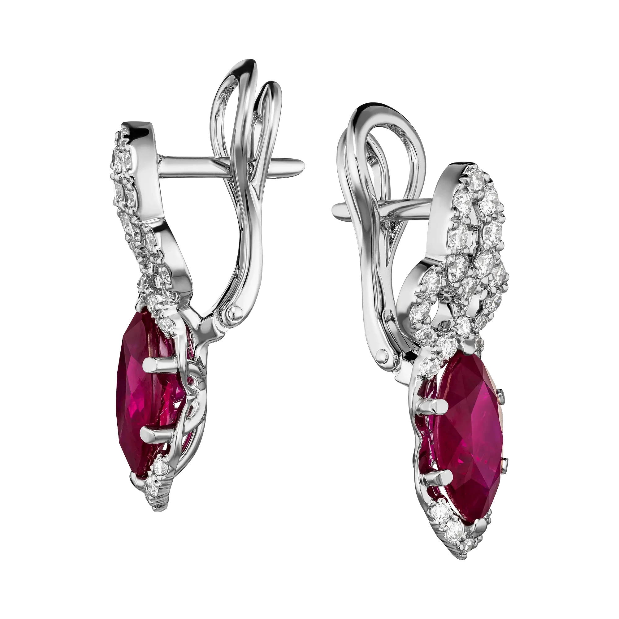 Белое золото, инкрустированное бриллиантами, создаёт ореол сияния вокруг рубинов, усиливая их внутренний свет. Контраст холода и жара превращает композицию в ювелирную симфонию – гармонию, в которой блеск и пламя звучат в унисон.