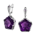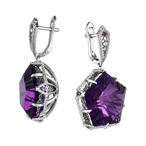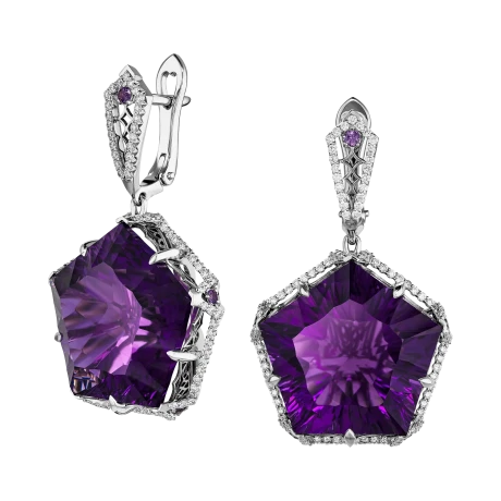 В серьгах «Очарованная Флоренция» бразильские аметисты редкой фантазийной огранки общим весом 47,05 карат сияют словно драгоценные фрагменты города, где история и искусство переплелись в едином дыхании. Их необычная форма напоминает геометрию флорентийских улиц и силуэты дворцов, рождая ассоциации с величием тосканской архитектуры.