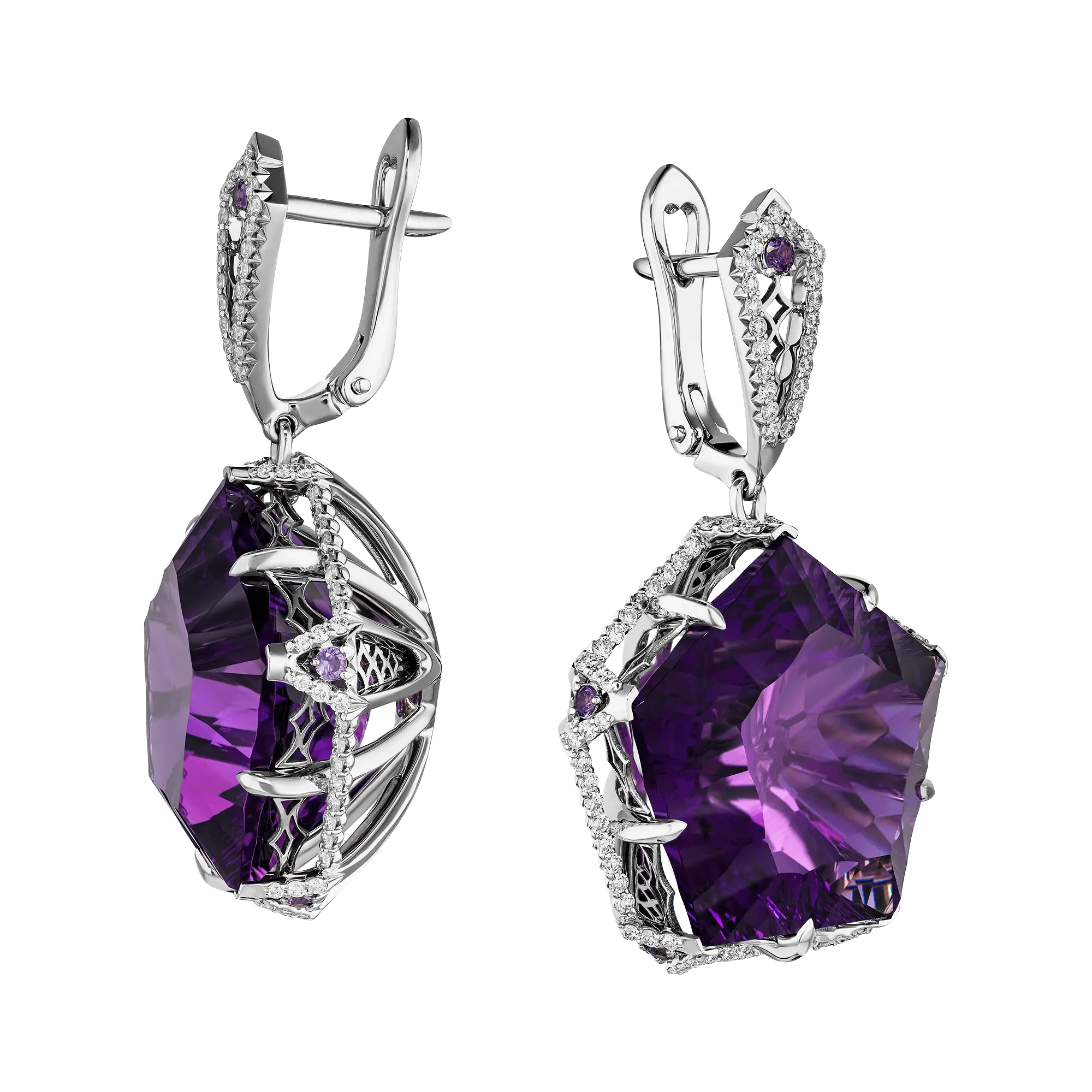Обрамление из бриллиантов и пурпурно-фиолетовых сапфиров усиливает глубину и насыщенность природных камней, создавая игру света, подобную солнечным бликам на мраморных фасадах соборов. Белое золото оправы завершает композицию, подчёркивая графичность линий и превращая серьги в изысканный символ гармонии.