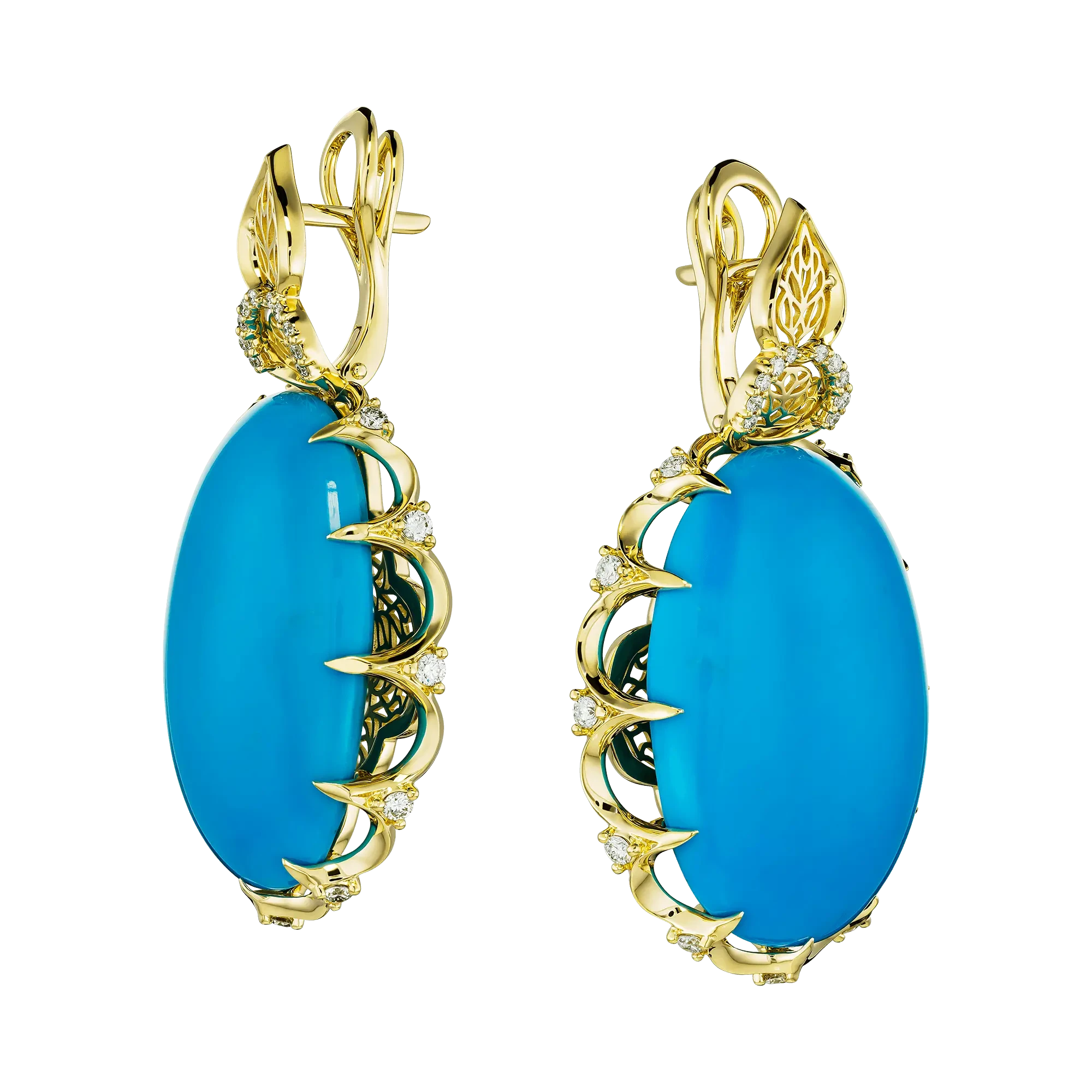 В композиции использован дуэт природных кабашонов из Аризоны общим весом 64,50 карата. Эти самоцветы ценятся за выразительность небесно-голубого оттенка, мягкую глубину цвета и естественный природный рисунок. Каждая бирюза индивидуальна, словно отдельная остановка на пути, и именно эта неповторимость формирует живой, подвижный характер украшения.