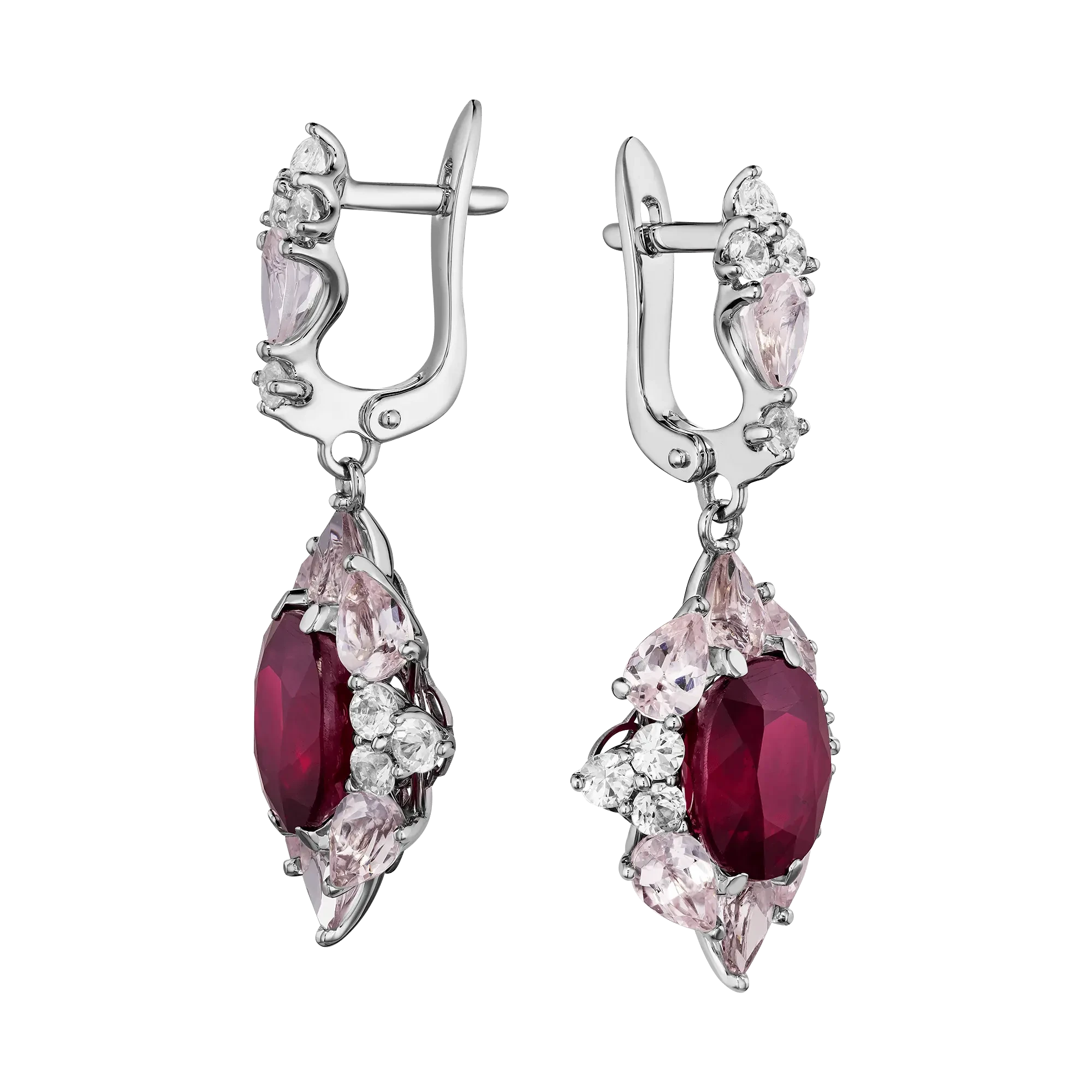 Вокруг сияют мягкие розовые морганиты и чистые белые сапфиры, создавая утончённую палитру, где тёплые и холодные тона переплетаются, усиливая глубину и объём центральных камней. Их блеск напоминает всполохи рассвета, отражённые на драгоценных гранях.