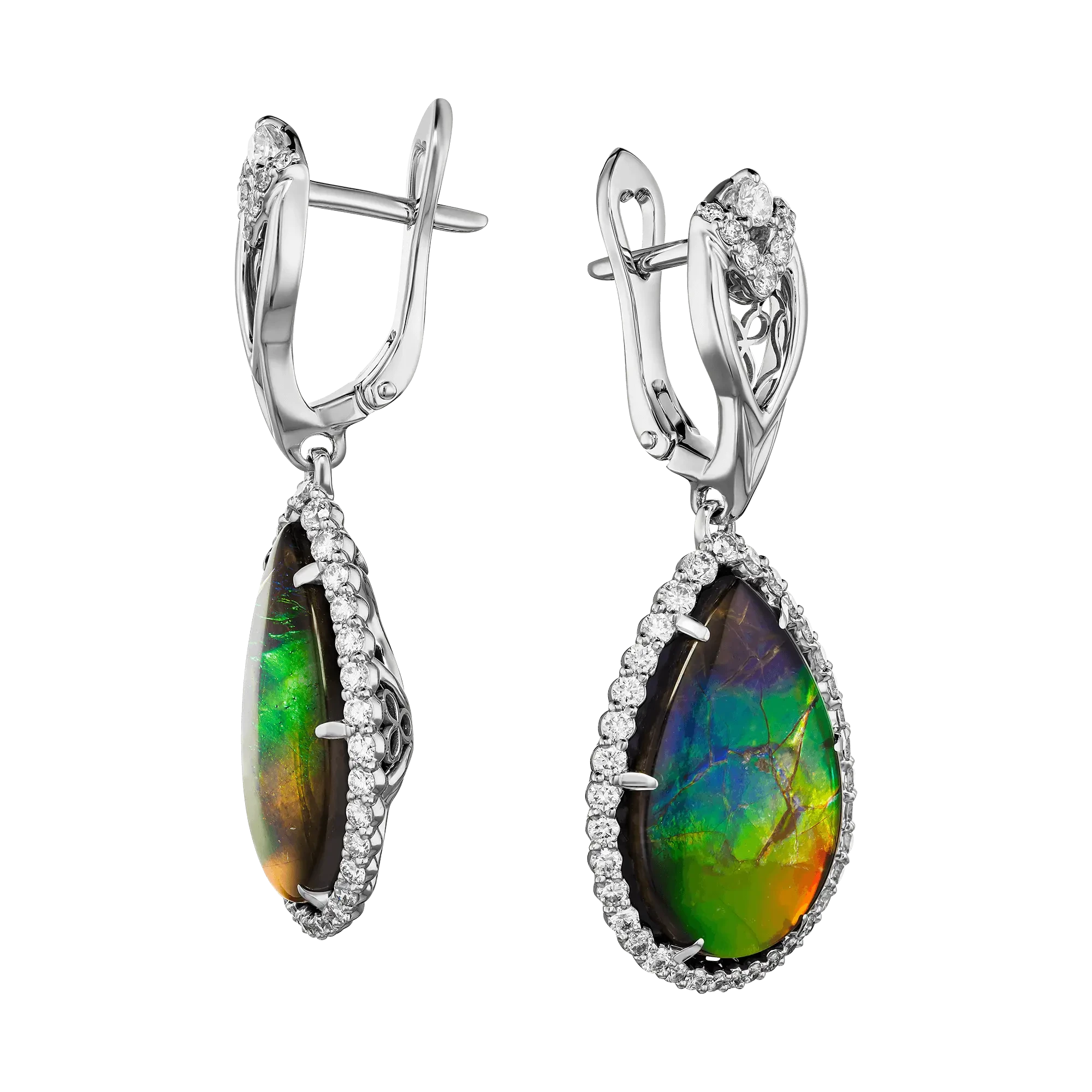 Оправы из белого золота, украшенные бриллиантами, обрамляют аммолиты сияющим ореолом, усиливая глубину цвета и подчёркивая природную сложность рисунка. Свет в подвижных серьгах словно пульсирует, напоминая о вечном дыхании океанов.