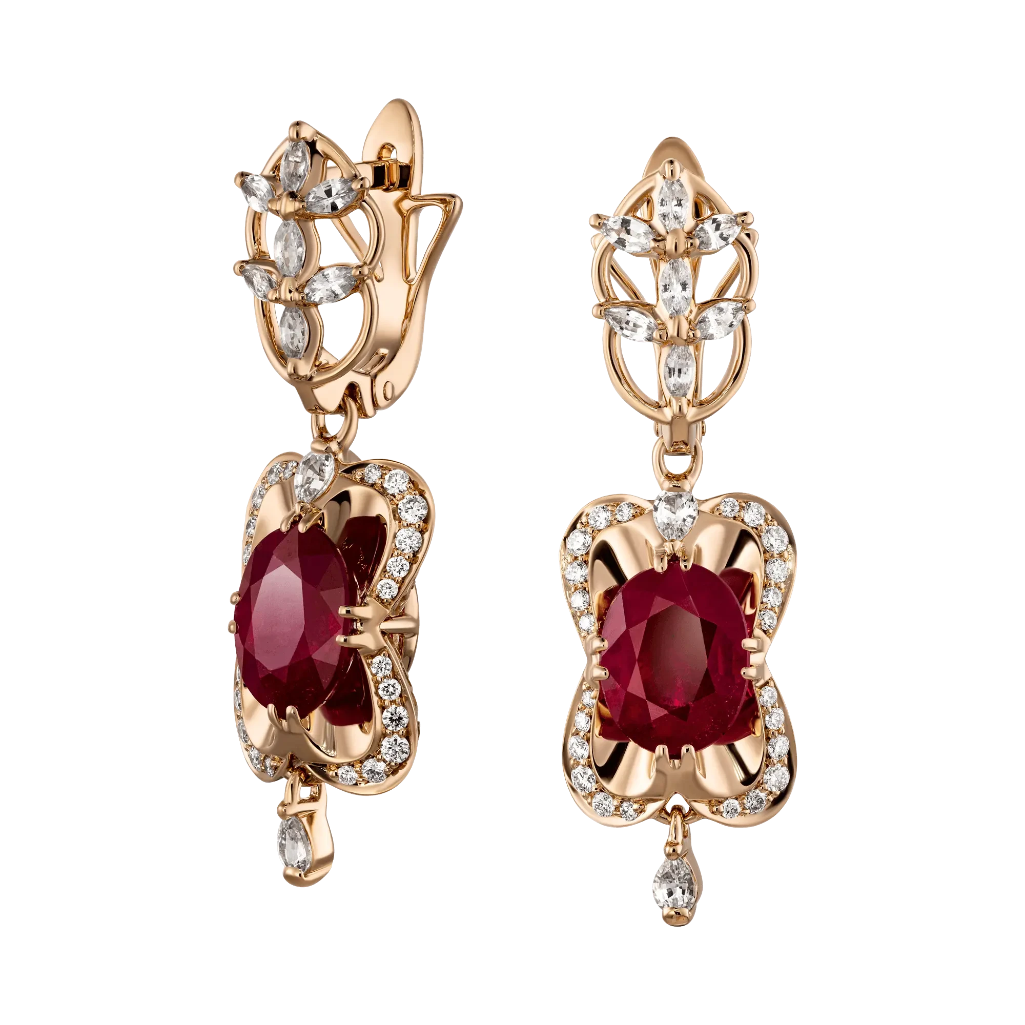 Страстная, всеобъемлющая сила драгоценности затягивает и моментально покоряет при визуальном контакте, будто пылкое искреннее признание, перед которым невозможно устоять. В эмоциональной структуре авторского украшения главное место мастера отвели двум сочным рубинам общим весом 4,91 карат. Глубинная чистота и яркая наружная экспрессия, выраженная в насыщенном цвете минералов, идеально сочетается со сверкающим великолепием обрамляющих бриллиантов и сапфиров.