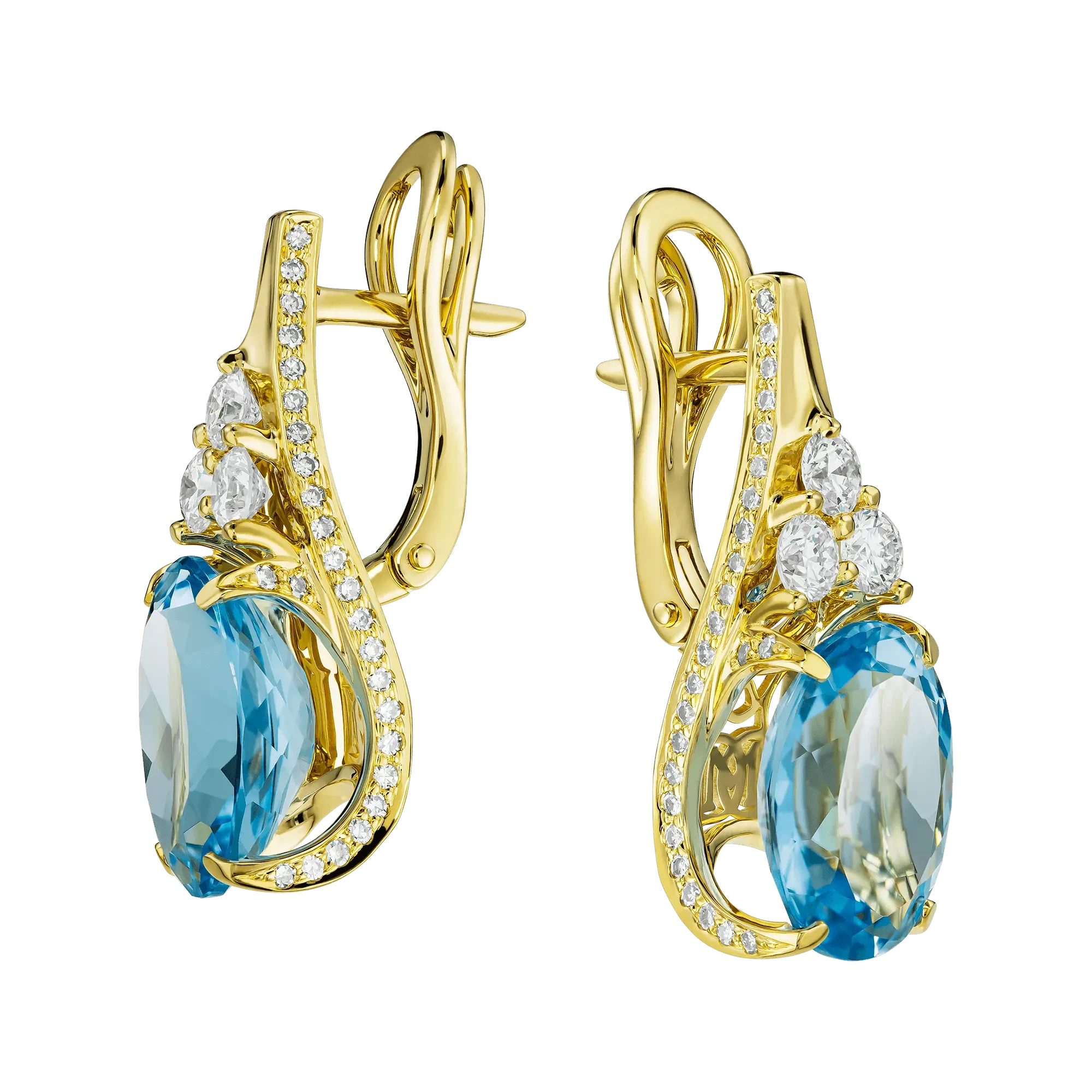 Бриллианты формируют вокруг топазов тонкое световое окружение, усиливая их прозрачность и добавляя живую игру бликов. Жёлтое золото оправы вносит тёплый акцент, уравновешивая прохладную палитру и подчёркивая изящную архитектуру формы.