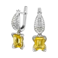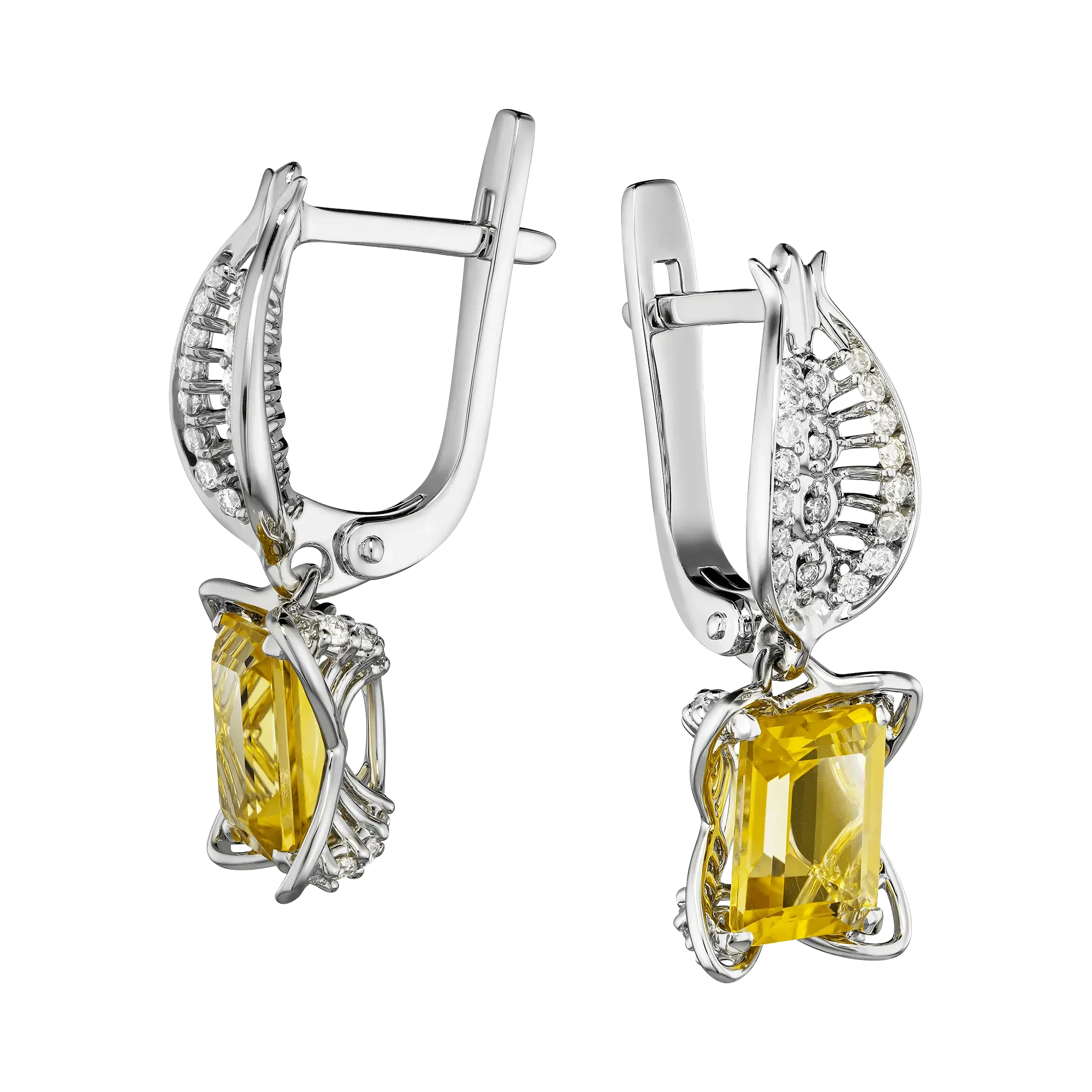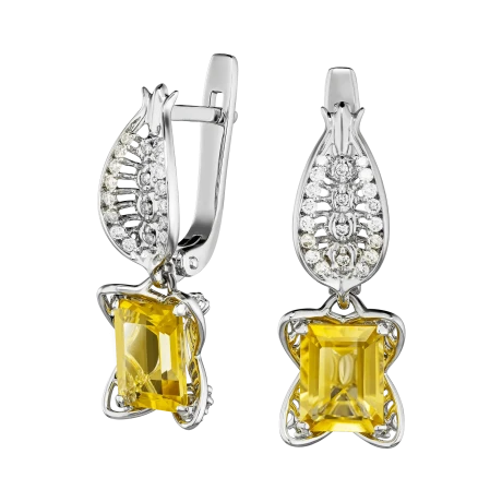 Цитрины медового оттенка проявляют насыщенность постепенно, сохраняя ровное свечение без резких вспышек. Их прозрачность позволяет свету свободно работать с цветом, усиливая глубину и плотность оттенка. Ажурная оправа из белого золота, инкрустированная бриллиантами, формирует световой ритм, в котором оттенок камней становится более выразительным именно за счёт отражений.
