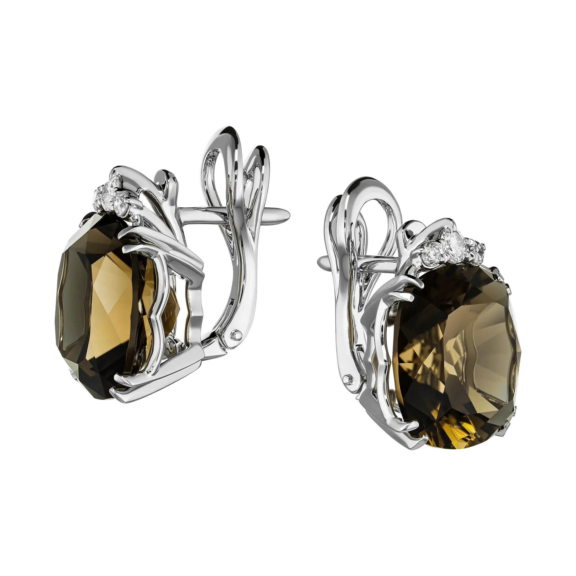 В центре каждой серьги – дымчатый кварц из бразильского Минас-Жерайс, региона, где природа рождает кристаллы с редким, тёплым бронзово-дымчатым оттенком. Камни будто удерживают в себе отблеск заката: их цвет меняется от прозрачного янтарного сияния до густого сумеречного полутона, создавая живую игру света при каждом движении.