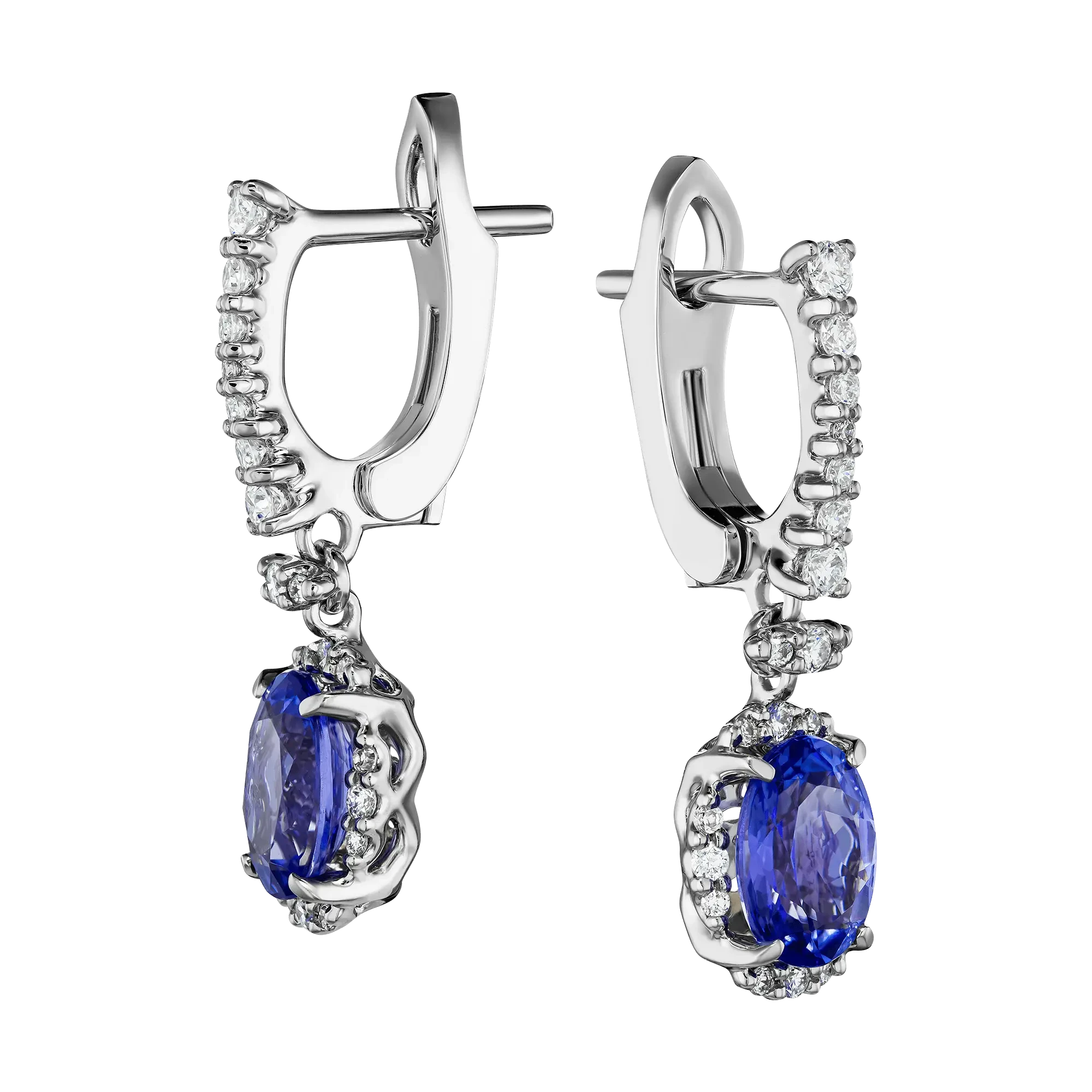 Интонация серёг отражается в цвете и раскрывается через движение, формируя цельный, выразительный образ. Танзаниты общим весом 2,47 карата словно собирают в себе разные состояния неба — от прохладной голубизны до глубокого синего с тонкими фиолетовыми переливами. Их природная изменчивость создаёт ощущение глубины и живого сияния, каждый раз раскрывающегося по-новому.