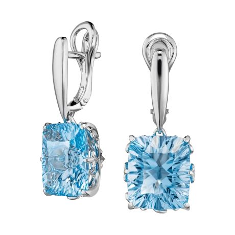 В центре композиции сияют бразильские голубые топазы общим весом 20,94 карата. Их чистый небесный оттенок и прозрачность ассоциируются с кристальной водой, в которой свет преломляется тысячами искр. Огранка природных камней позволяет каждой грани отражать лучи с особой интенсивностью, создавая игру света, которая словно растворяет время и наполняет пространство свежестью.