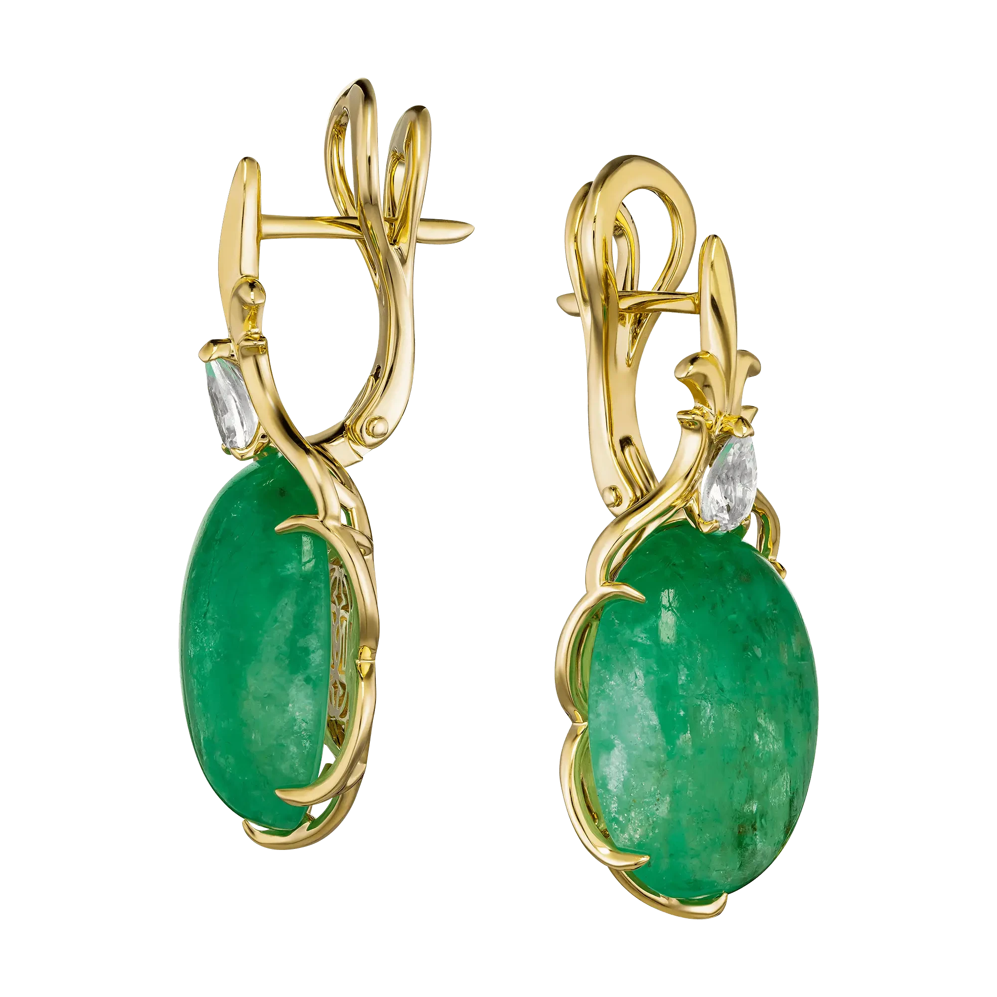 Оправы из жёлтого золота окутывают самоцветы теплом, создавая контраст между хрустальной прохладой изумрудов и сиянием металла. При каждом движении серьги словно оживают, отражая свет новыми оттенками – от прозрачного зелёного инея до глубокого малахитового свечения.