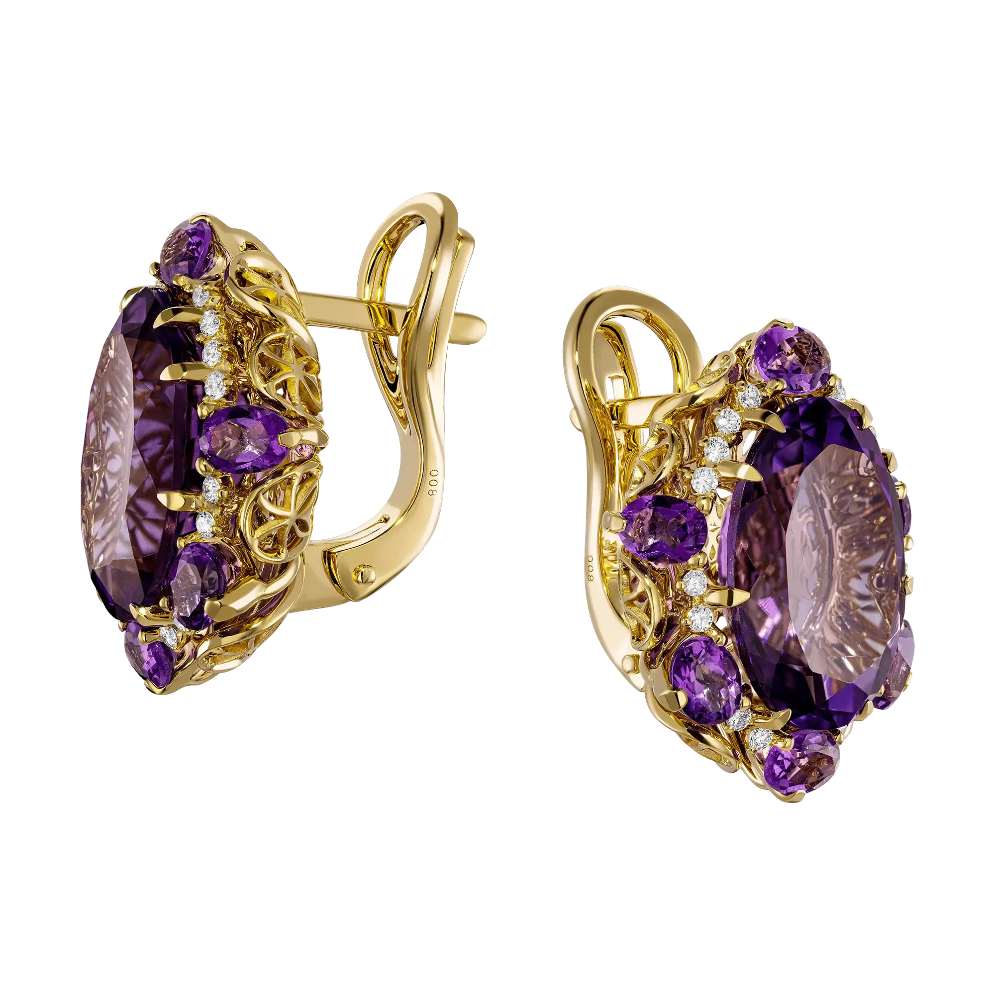 Собранные в единое целое несколько чистейших аметистов общим весом 11,06 карат с особенно ярко выделяющимся гегемоном в самом центре мягко покоряют редким, насыщенно фиолетовым цветом, достойно выглядящем в образе современной королевы. Соседство с россыпью сверкающих бриллиантов позволяет еще сильнее подчеркнуть красоту лиловых кристаллов, способных расширять высший разум, что поможет владелице отбросить все сомнения и отдаться романтическим чувствам.